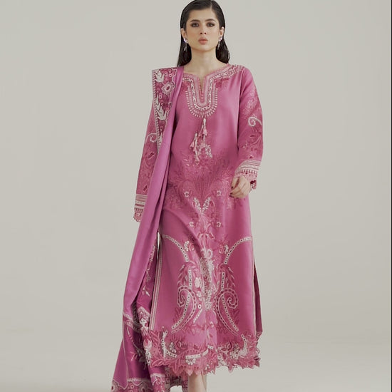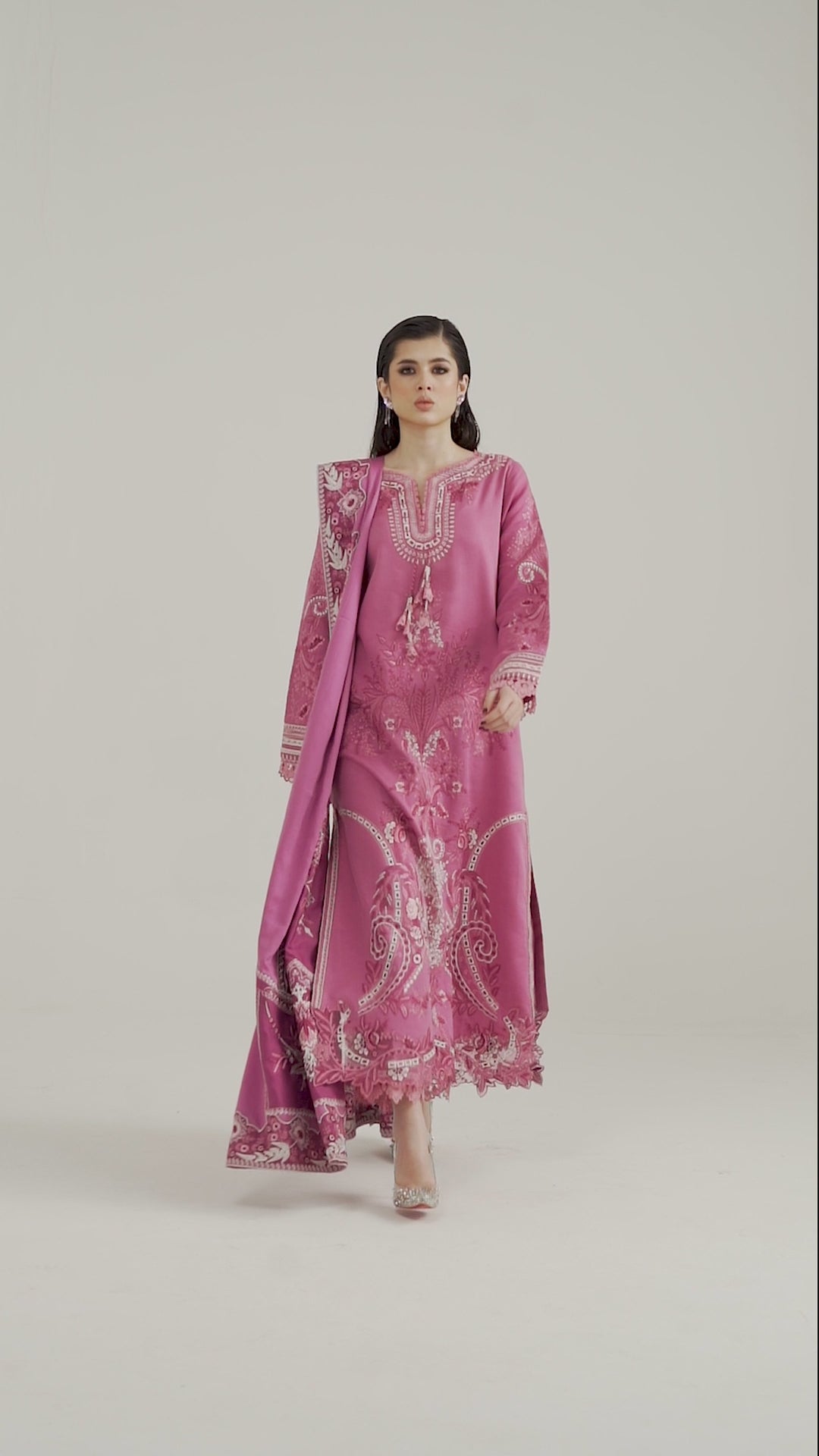 Create a statement look this season in a timeless and elegant shade of pink, where grace meets sophistication. This enchanting ensemble features intricate embroidered details on the shirt and is paired with a matching shawl thus creating a captivating fusion of feminine charm and classic style.