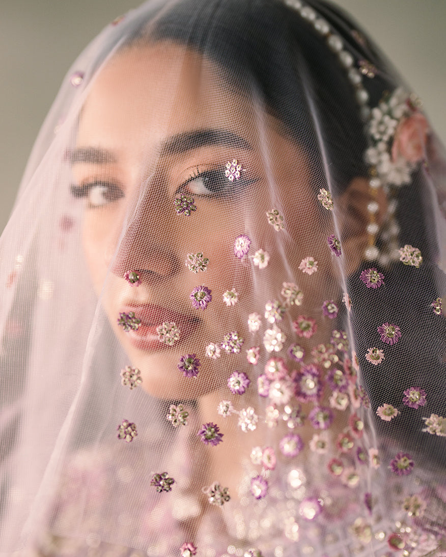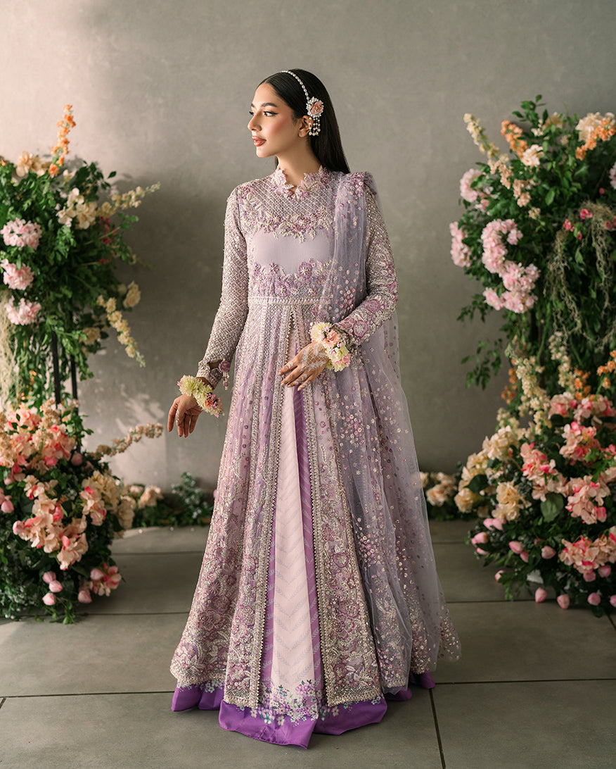 Alyana —a true statement of elegance and artistry. Featuring hand-embellished details on delicate chiffon, this ensemble combines timeless sophistication with modern flair. The look is elevated by a net dupatta, intricately embroidered and adorned with sequins, adding a touch of shimmering grace.