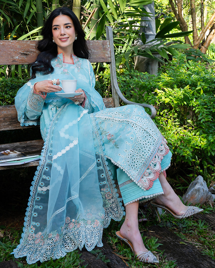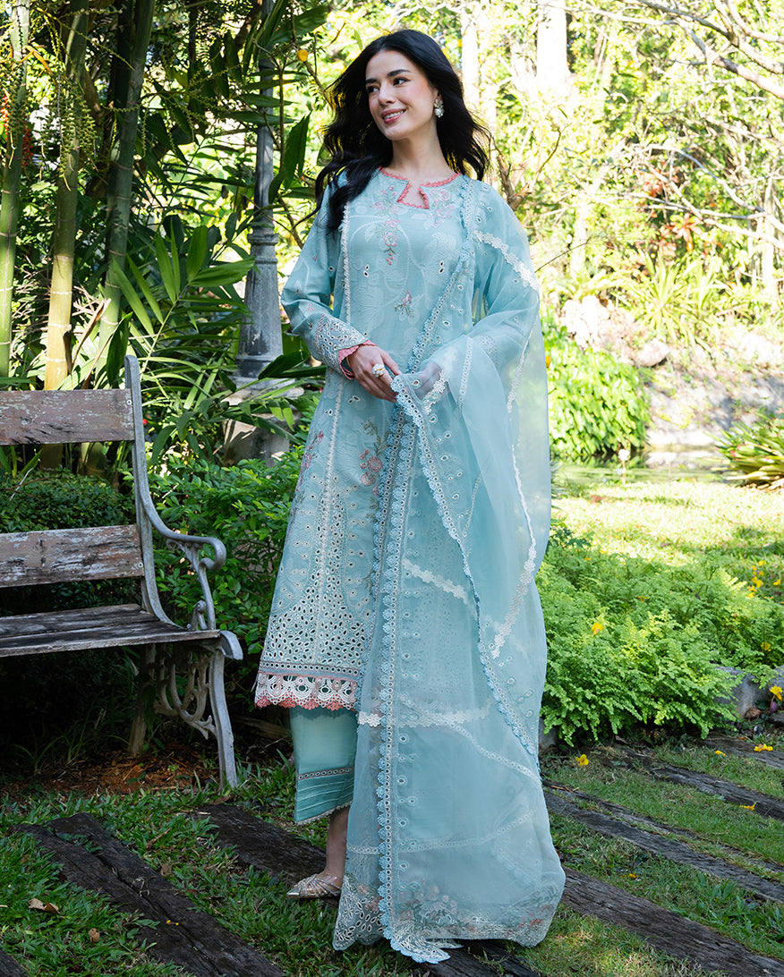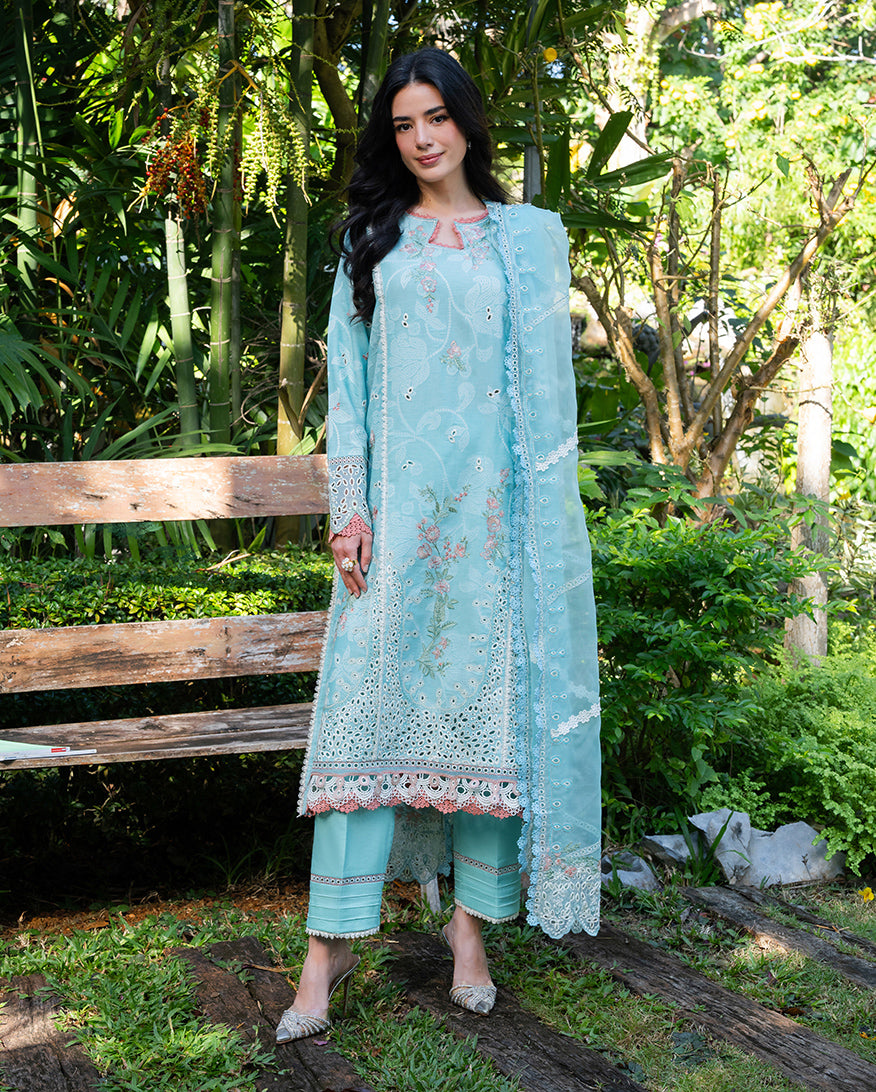 Amalfi Breeze is a light blue jacquard suit from the La Toscana casual pret collection crafted for the woman who wants her summer dressing to feel both relaxed and refined. The shirt is tailored from textured jacquard fabric that carries a natural structure and subtle sheen, paired with breathable cotton trousers that make it an ideal choice for warm-weather wear. A pure organza dupatta in a matching tone completes the three-piece, lending an airy, elegant finish perfect for casual outings, festive lunches, and summer gatherings.