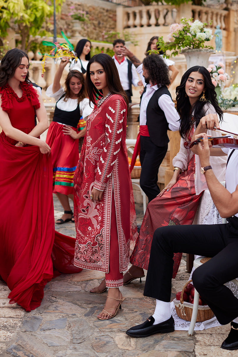Amore Affair in ravishing red, where intricate chikan and laser embroidery meet handmade embellished tassels for an enchanting neckline. Paired with a pure chiffon dupatta featuring a mesmerizing digital print, this ensemble is a celebration of love and elegance.