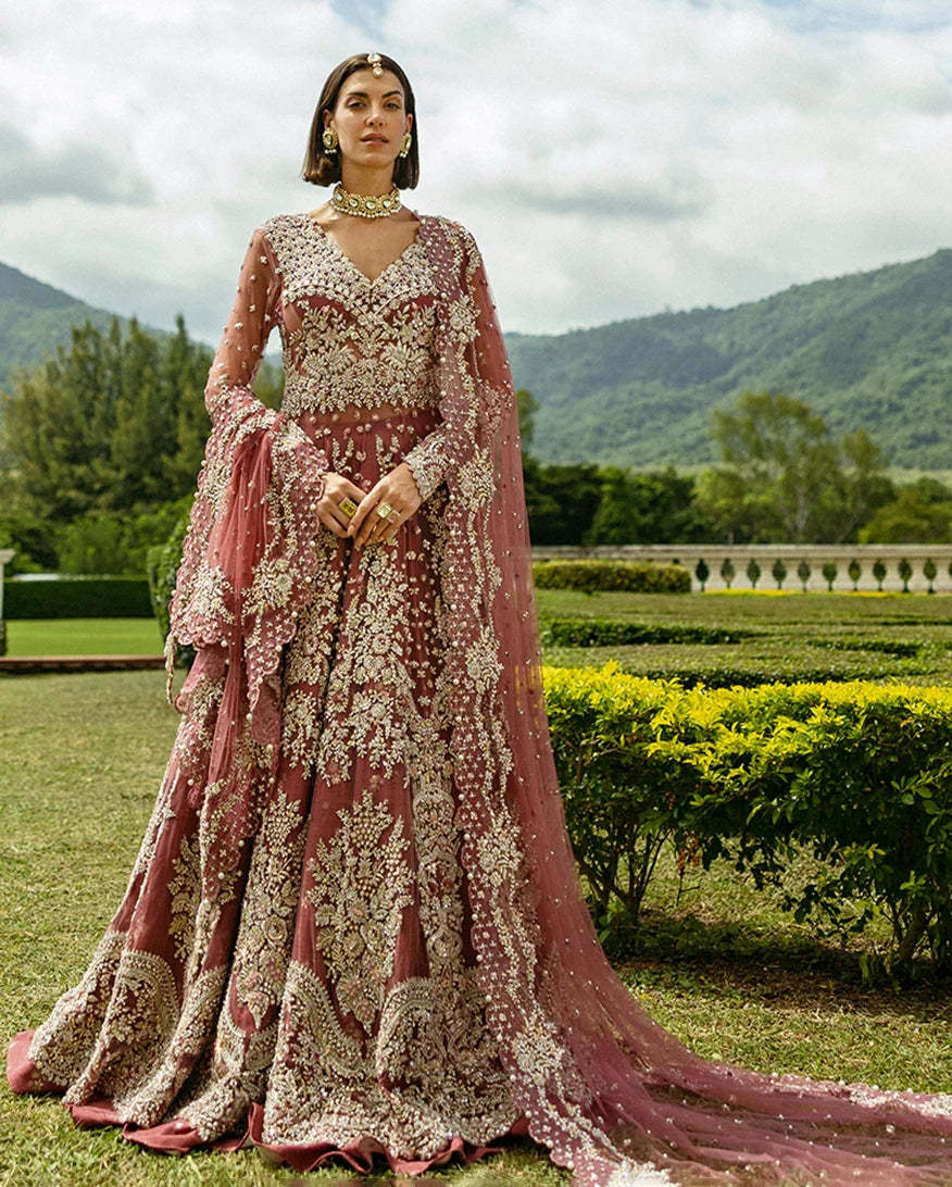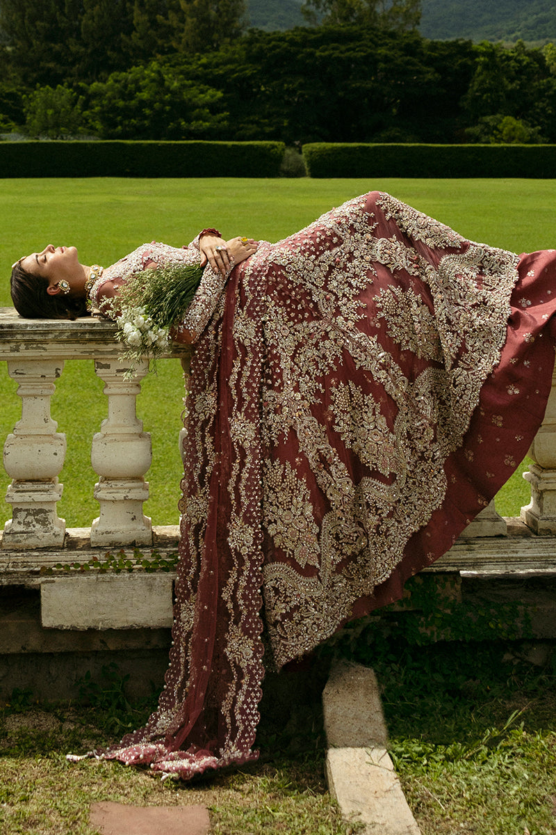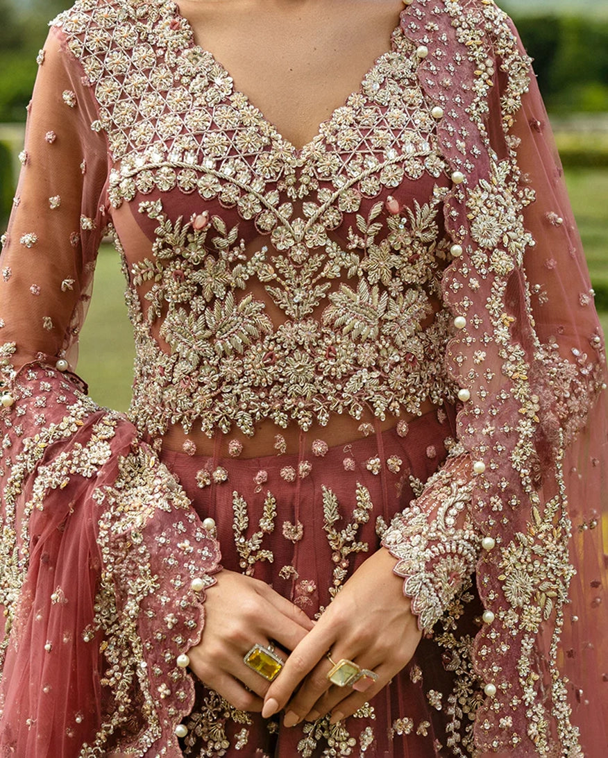 Crafted from net and Korean raw silk, this wedding dress is adorned with beautiful dabka, pearls, and sequins. Detailed thread work and naqshi add depth, while pearl drops bring an elegant finish. A stunning choice for your wedding, Arabella