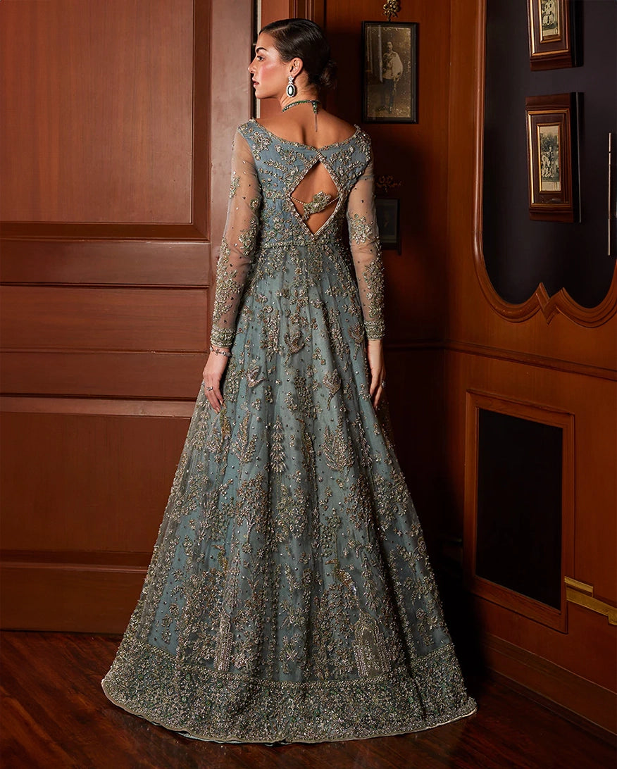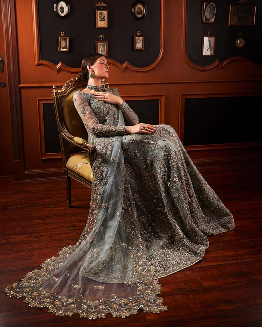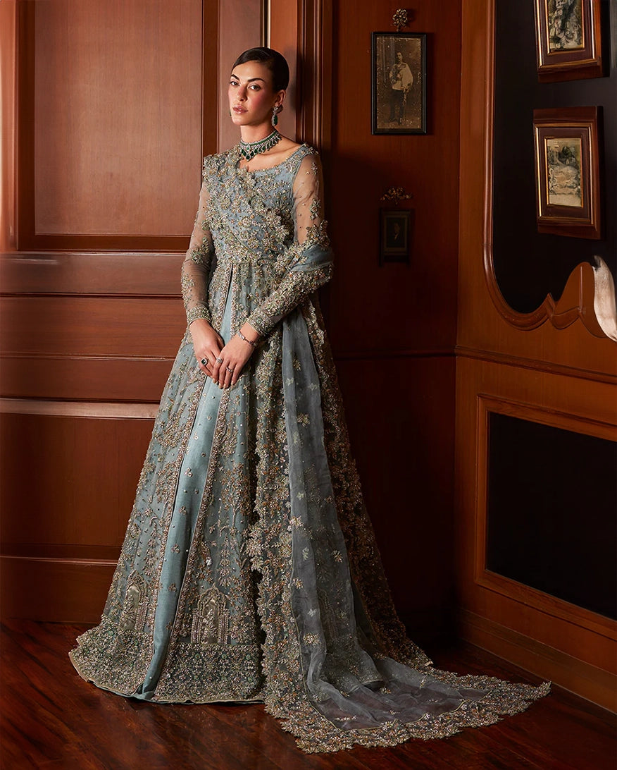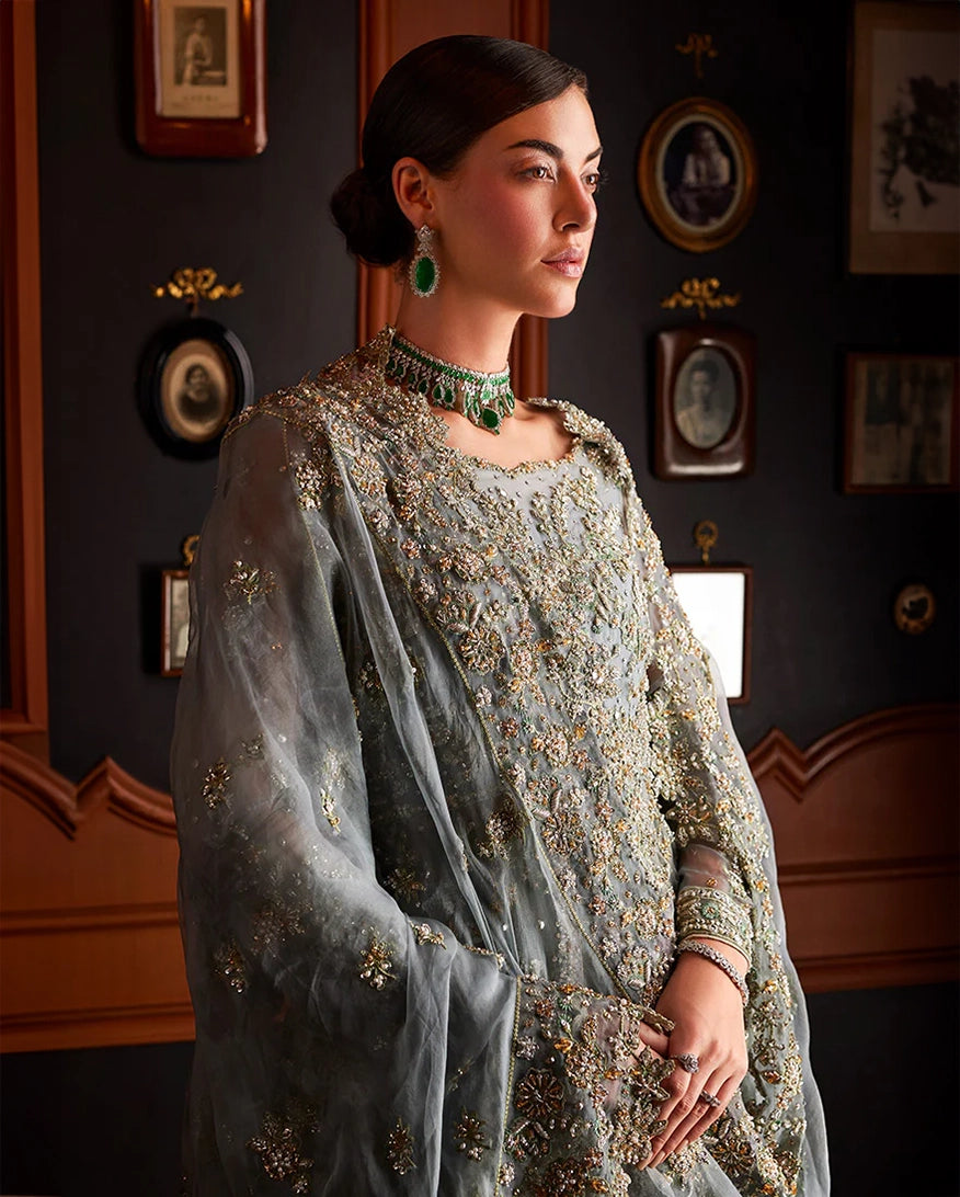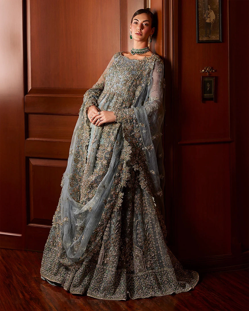 Meet Aurelia, a vision of pure splendor and artistry. Crafted with precision and passion, this bridal ensemble boasts a rich tapestry of heritage techniques. The bodice, adorned with resplendent hand work, is a tribute to the exquisite craftsmanship, while the flowing silhouette, intricately embroidered with zari, sequins, and naqshi, embodies contemporary elegance.