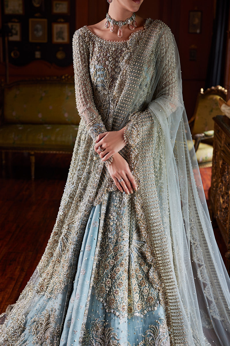 Calista, a celestial masterpiece that will captivate your heart and soul. This bridal outfit features a bodice embellished with celestial-inspired embroidery, reminiscent of the night sky adorned with stars like embellishments. The intricate beadwork, Swarovski crystals, and blue accents create a magical aura, while the flowing skirt, adds a dreamy, ethereal quality. The stunning neckline makes Calista a celestial symphony of artistry and grace.