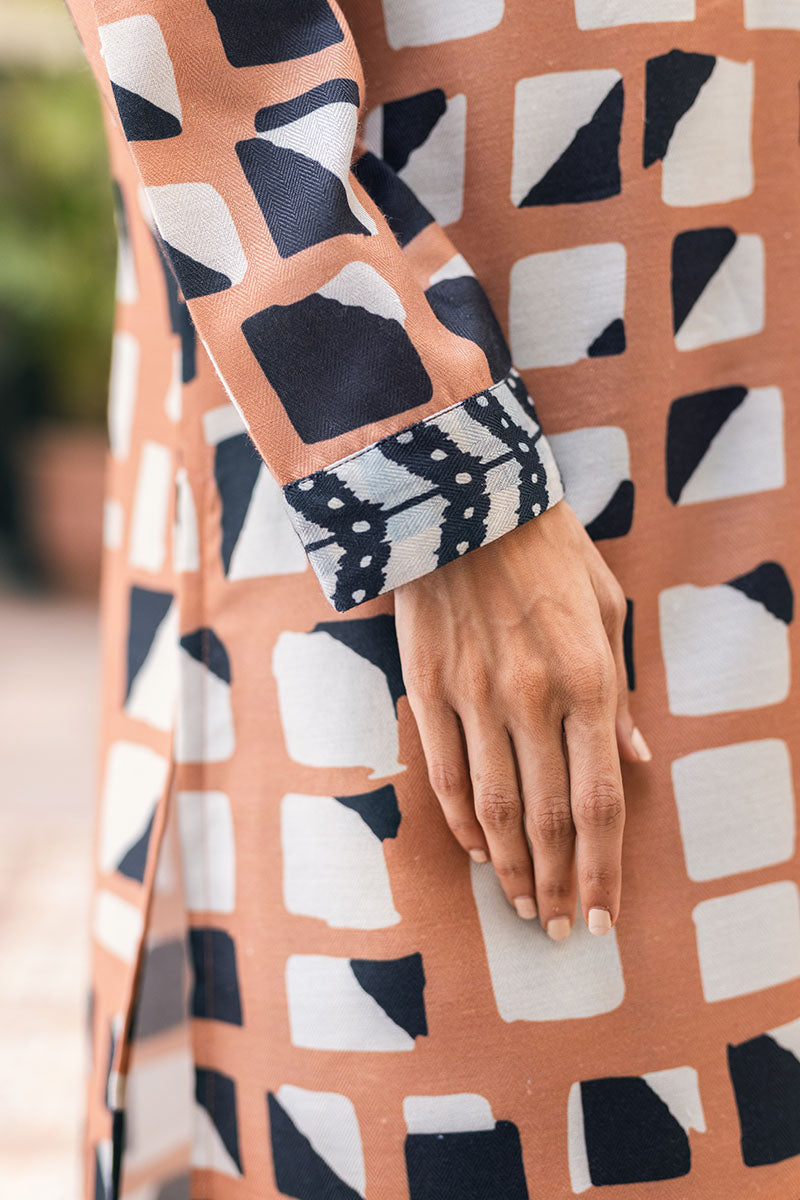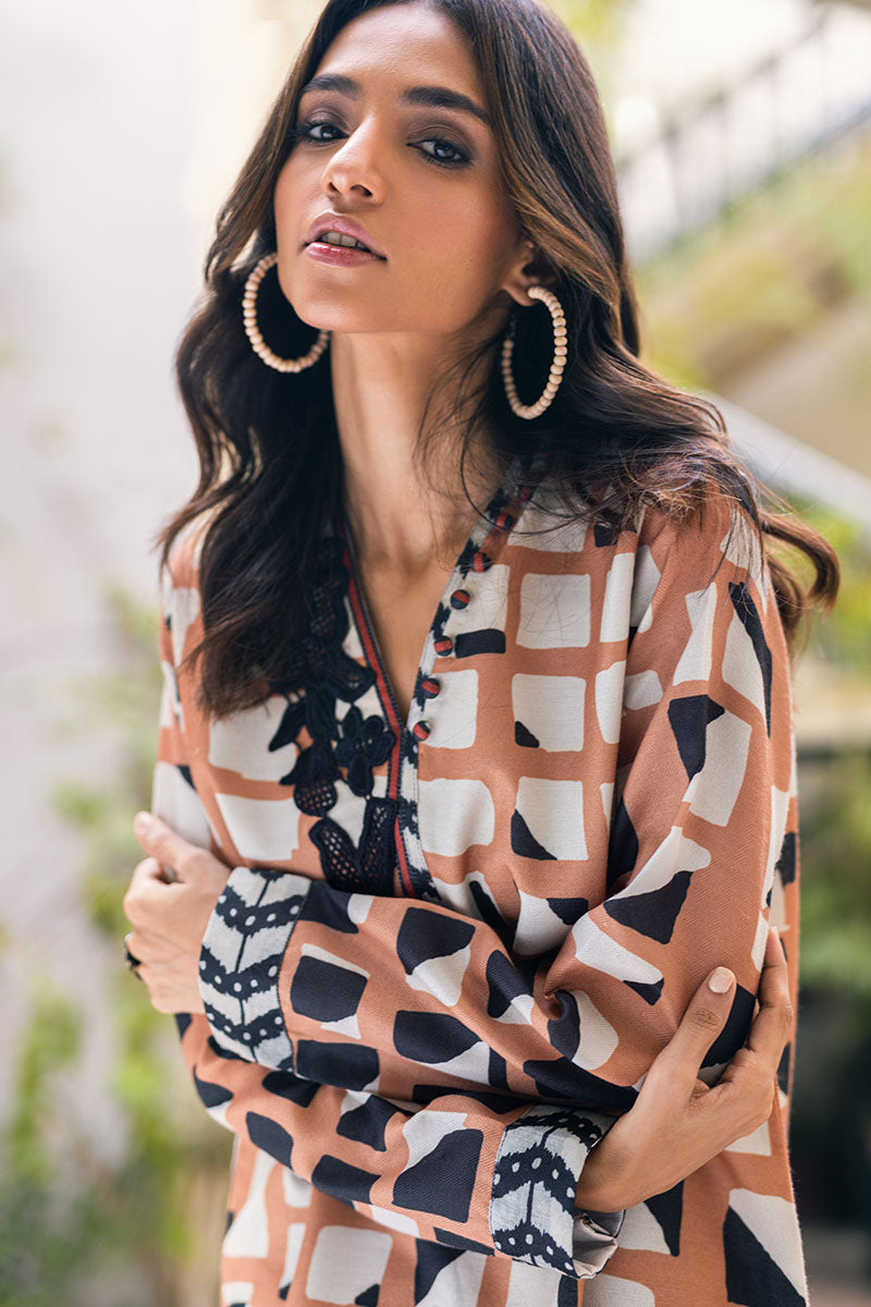 Adorning the neckline is a striking black embroidered motif, akin to a piece of intricate lacework carefully placed upon the fabric. The black embroidery against the brown and white printed backdrop creates a mesmerizing contrast, adding a touch of drama and sophistication to the ensemble.