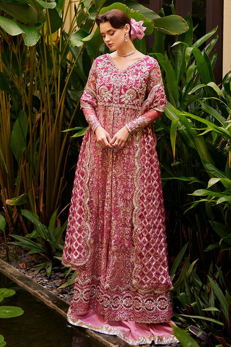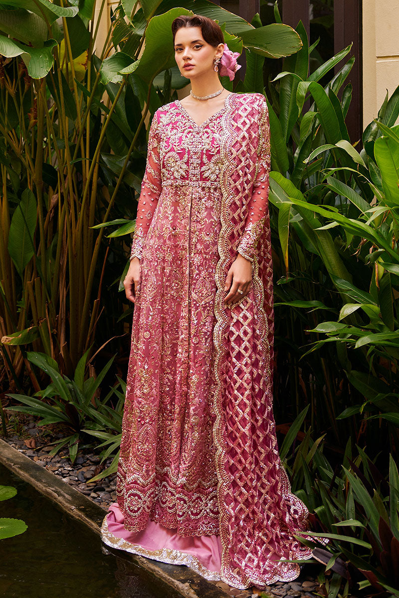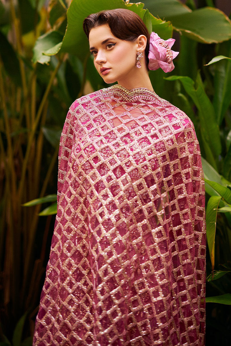 Embark on a journey of grace and allure in this pink ensemble, adorned with meticulous hand embellishments and glistening sequins. The ensemble's elegance is heightened by a sequinned net dupatta, casting an ethereal radiance while harmonizing flawlessly with a dyed raw silk lehnga.