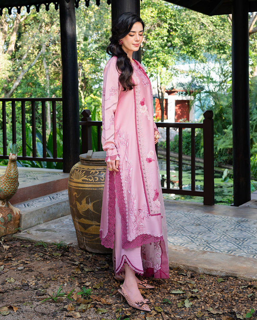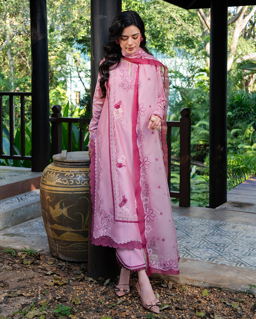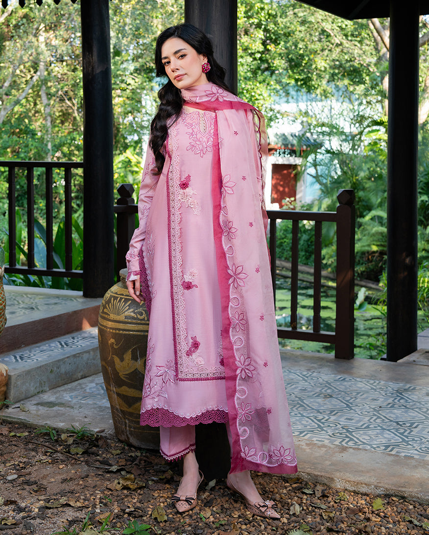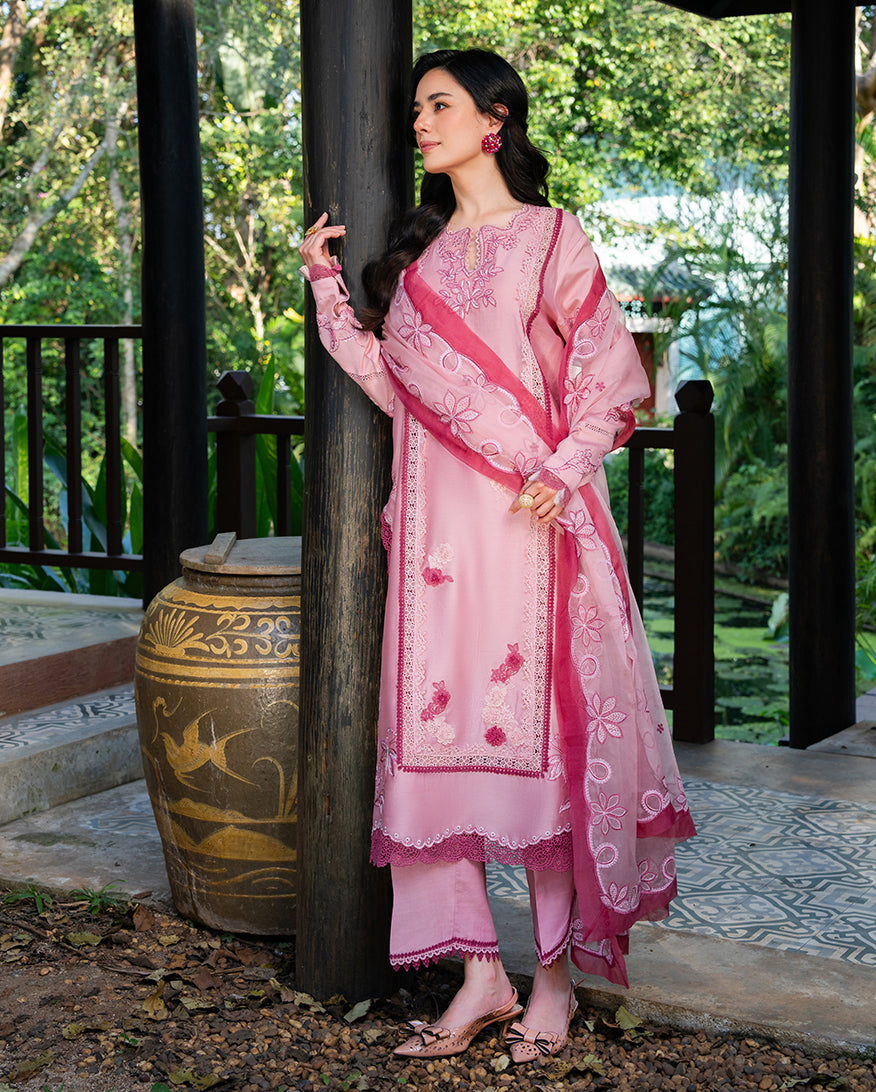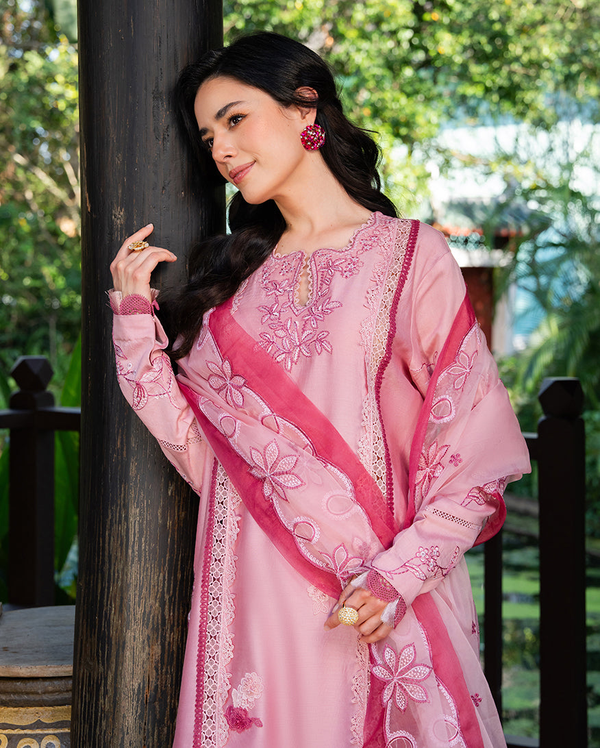 Dolce Meadow is a pink paper cotton casual dress from La Toscana. Soft, feminine, and designed for women who want their everyday wardrobe to feel as considered as their occasion wear. The paper cotton shirt is tailored in a straight, relaxed cut that moves with ease, while a raw silk trouser brings smooth texture and a refined finish beneath. An organza dupatta layered over soft cotton adds the finishing grace to this stitched three-piece, a perfect choice for casual dresses for women across Pakistan's summer season.