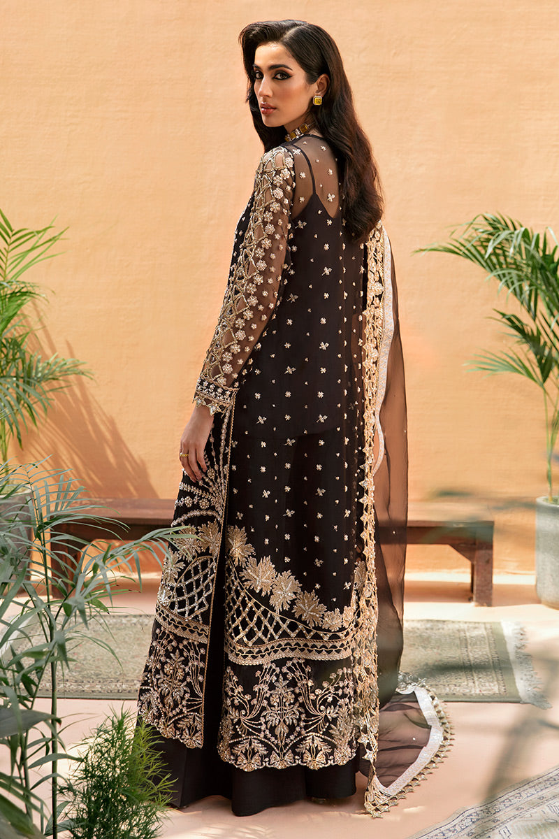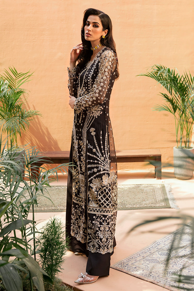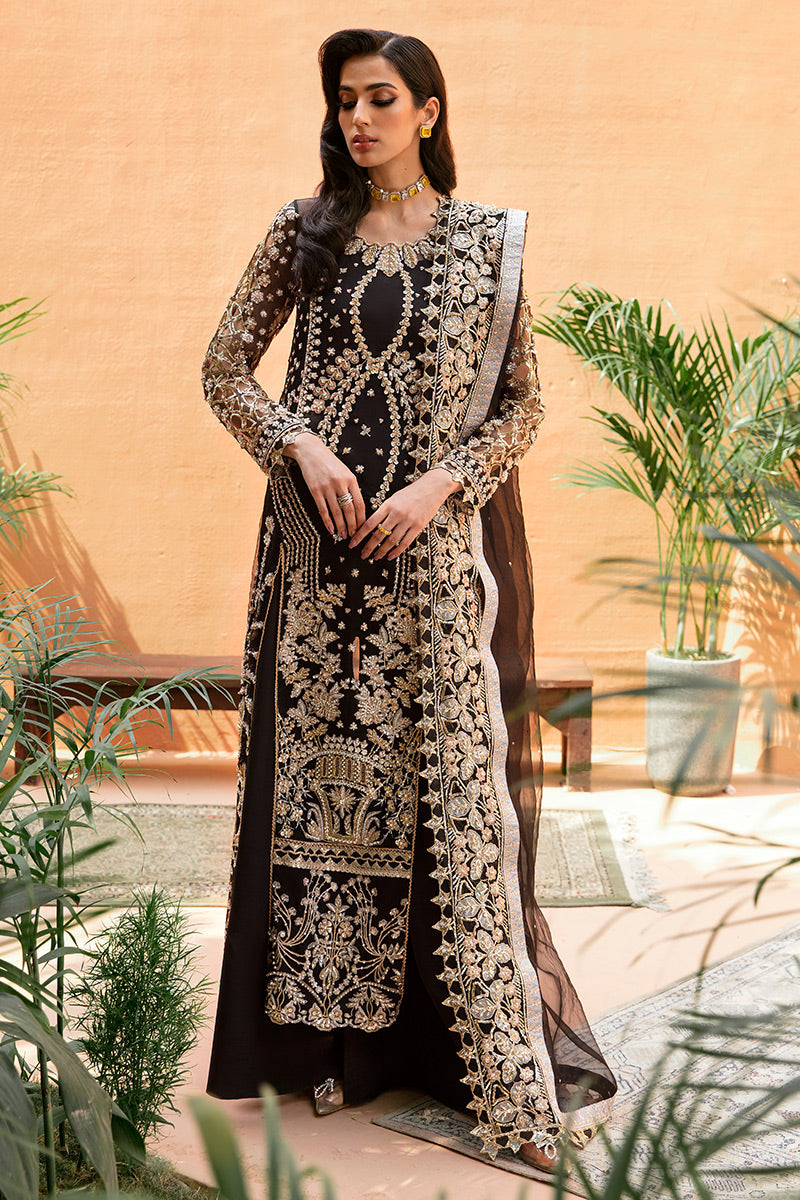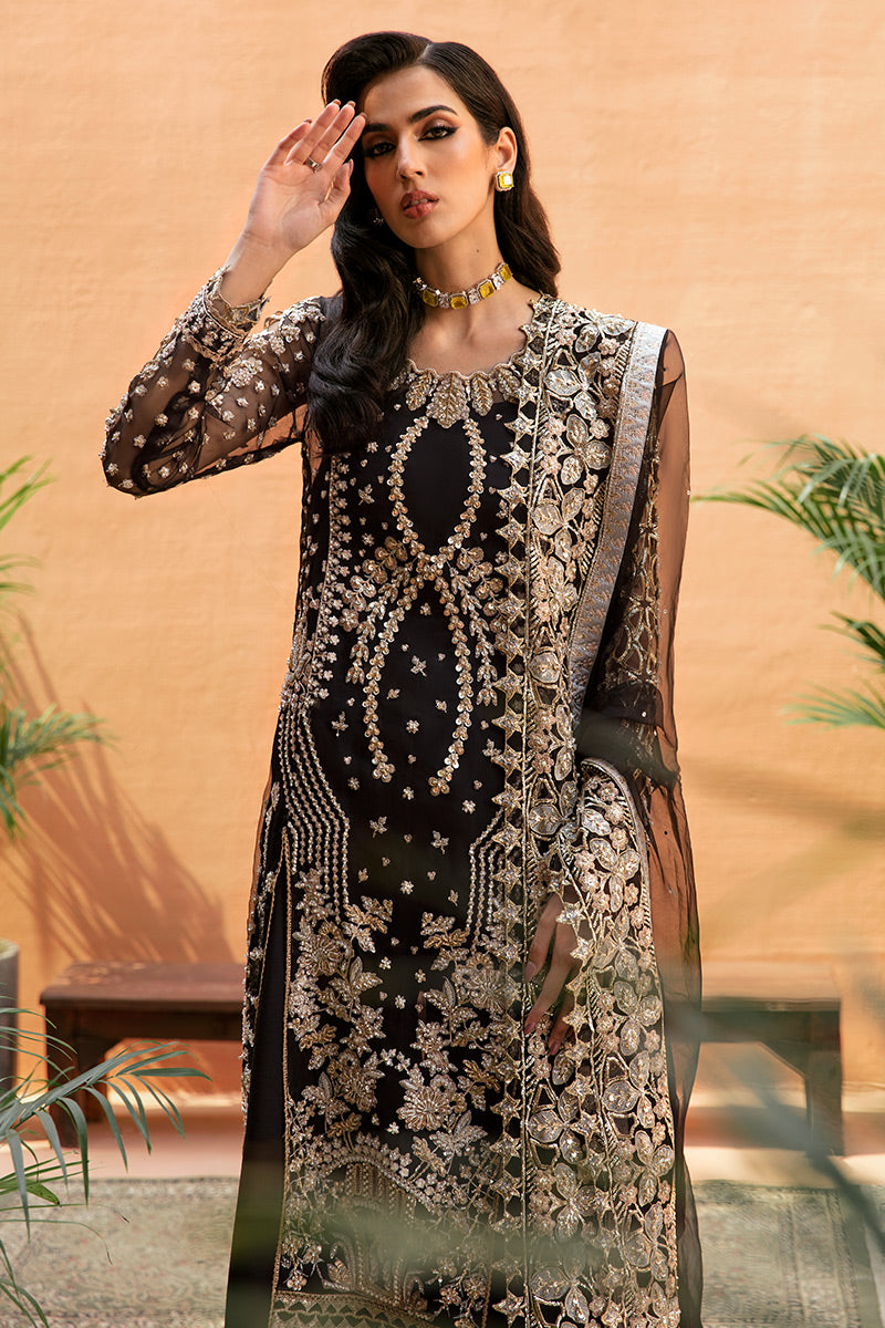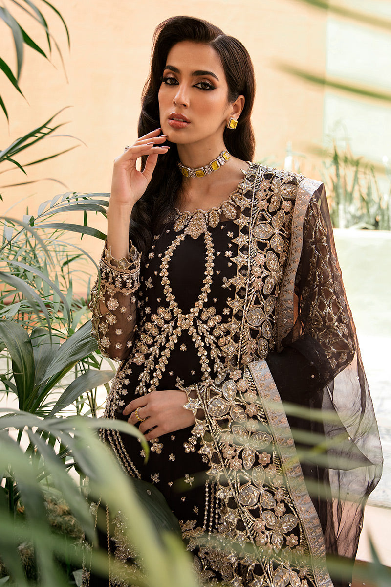 Draped in the allure of midnight skies, the rich black canvas of this extraordinary outfit Eleonora. Its luxurious texture glides gracefully, emanating an air of unparalleled grace and poise. This opulent attire showcases the masterful artistry of kora, dabka, naqshi, sequins, pearls, and Swarovski crystals.