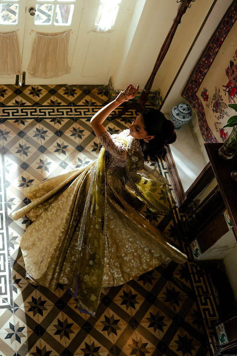 Elma is a masterpiece of timeless beauty. The satin zari yoke is adorned with intricate embroidery and embellishments, reflecting exceptional craftsmanship. Paired with a luxurious satin zari lehnga and a delicate kasab net dupatta, this ensemble embodies sophistication and grace.