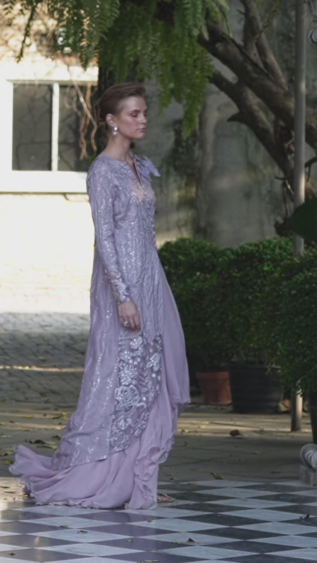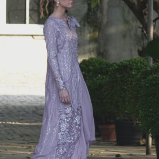 Ember in Lilac is the epitome of refined luxury, perfect for making a statement at any special occasion or event. The focal point of Ember is its raw silk and organza open shirt, a masterpiece of craftsmanship and elegance. Adorned with a myriad of intricate details, including Resham embroideries, hand-embellished Swarovski crystals, sequins, stones, pearls, 3D flowers, and luxurious fur, this shirt is a testament to opulence and sophistication. Complementing the shirt is a three-layered chiffon skirt, adding a touch of fluidity and grace to the ensemble.