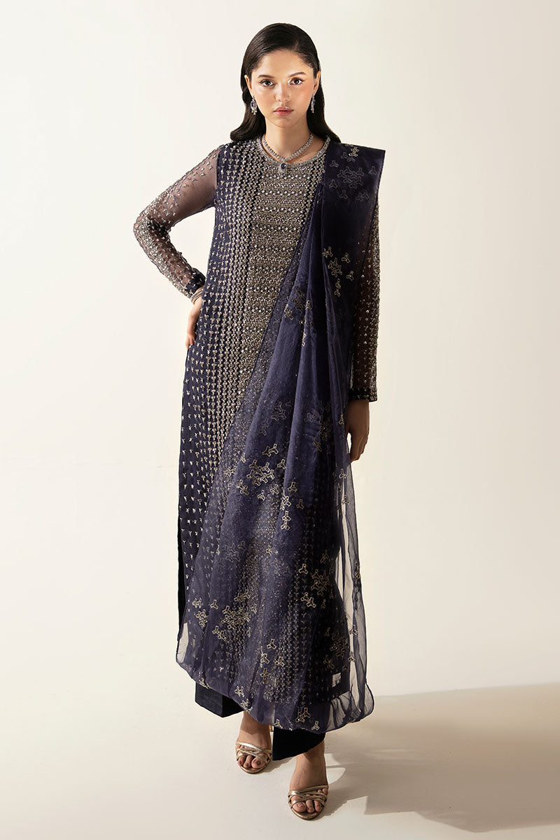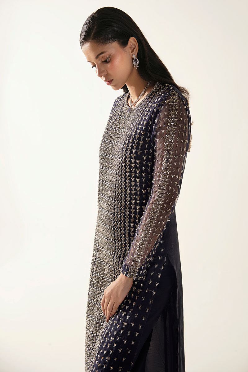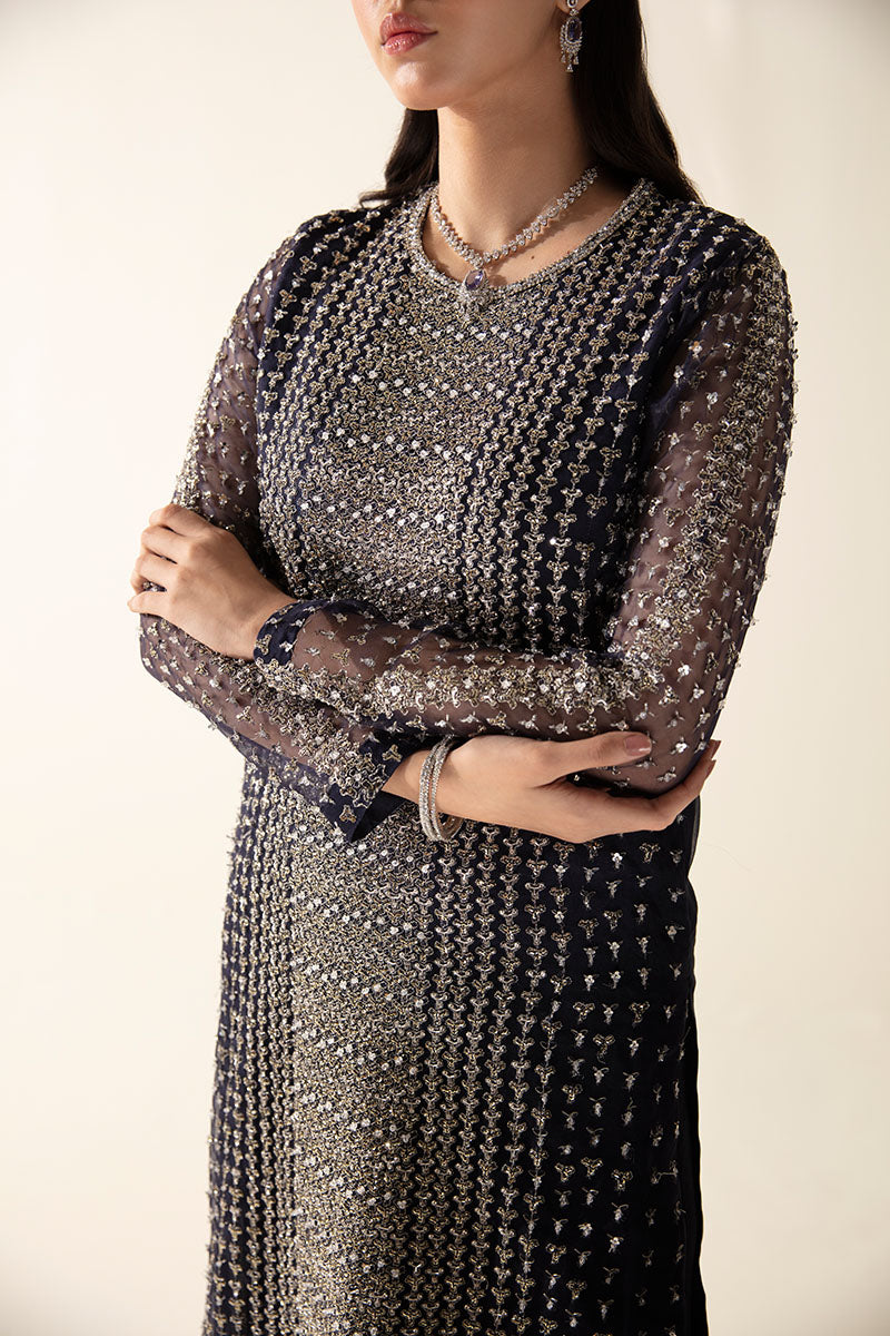 Esma, a midnight blue ensemble, transcends elegance and sophistication. The exquisite arrangement of cut dana embroidery, swarovski crystals, and modern pipe detailing makes it a wearable masterpiece that exudes opulence and refined style