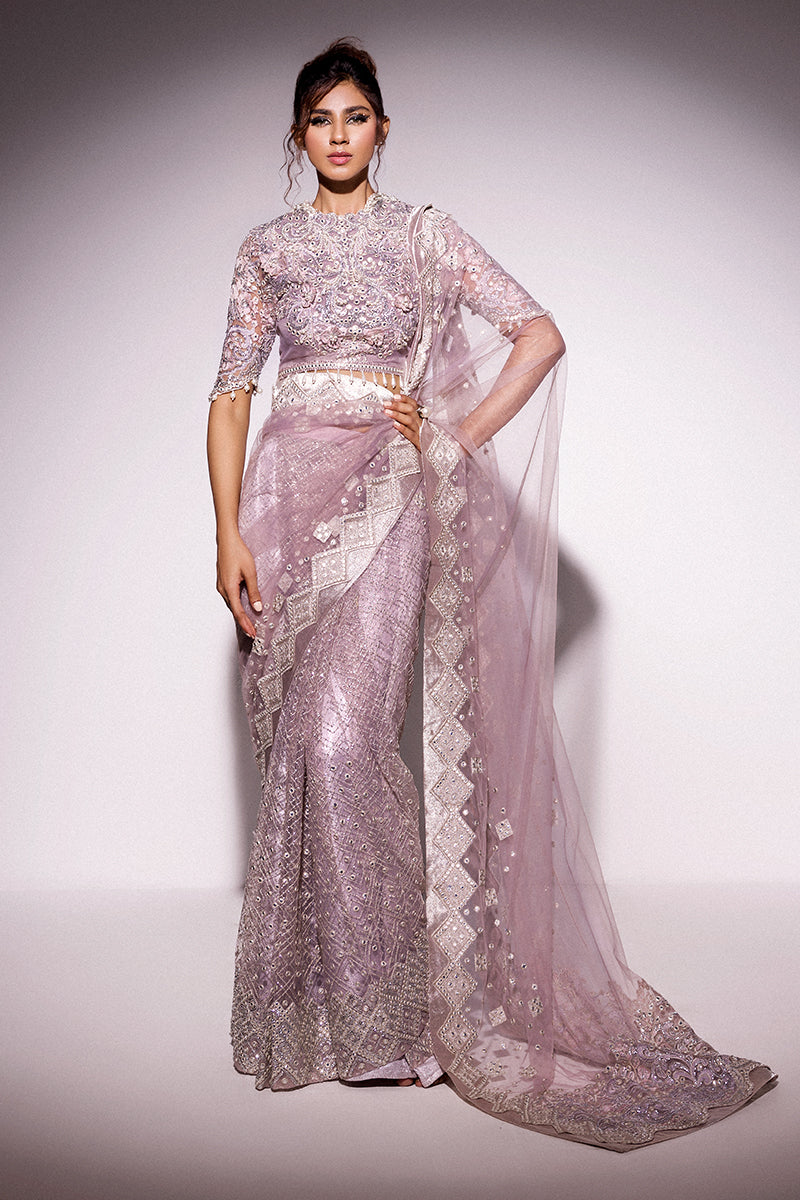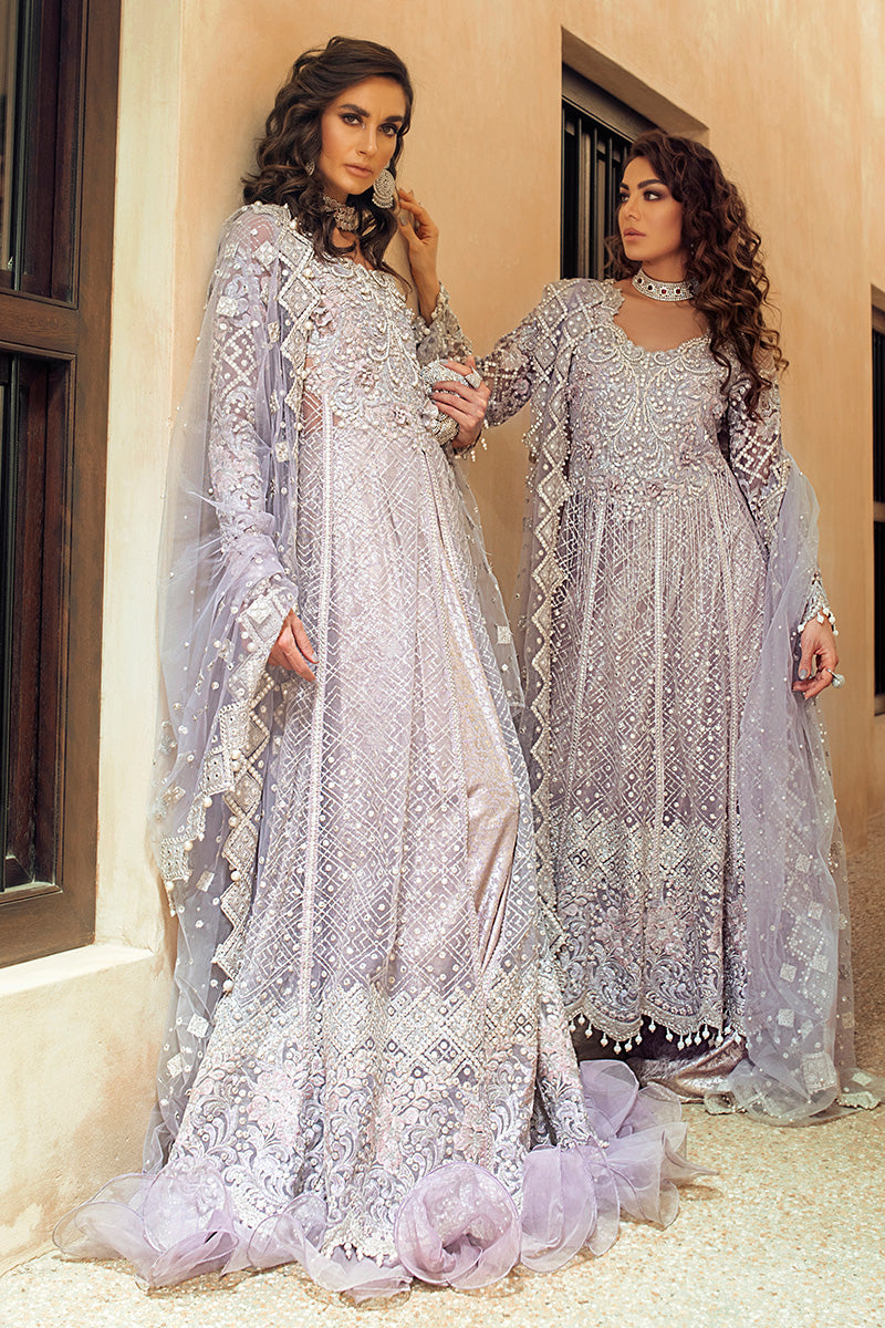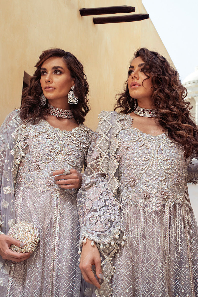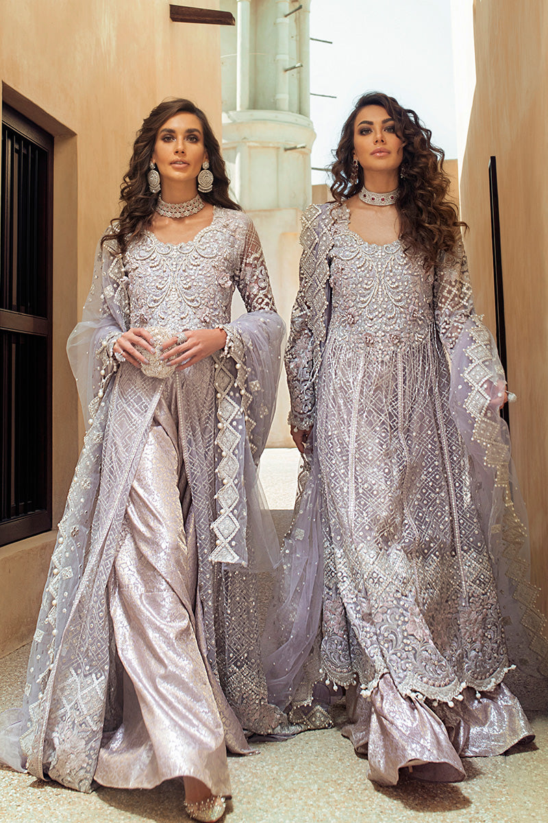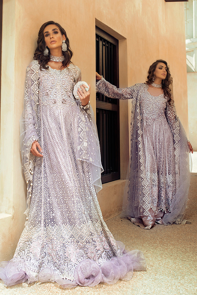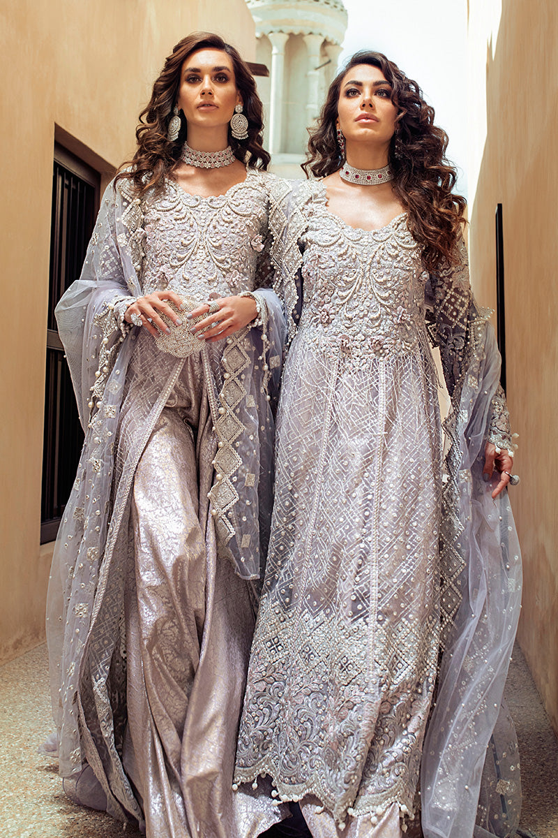 A heavily embroidered and hand embellished shirt comes with a silver jamawar lehnga and a matching net dupatta with pearl finishing. Advance payment is required for this outfit.