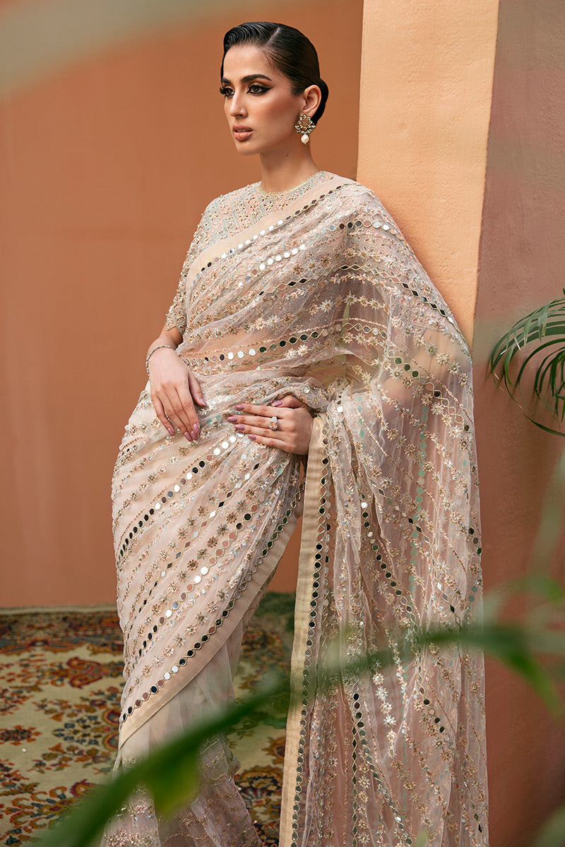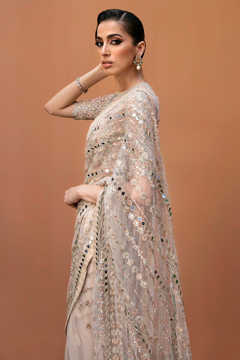 In a celebration of timeless beauty and refined elegance, we present an ethereal saree Fiamma in the serene hue of nude beige, adorned with exquisite handwork embellishments that evoke an air of opulence and grace. This captivating saree boasts a delicate and flowing drape, gracefully caressing the curves of the wearer. Crafted from luxurious fabric with meticulous attention to detail, it drapes like poetry, ensuring a timeless and flattering fit.