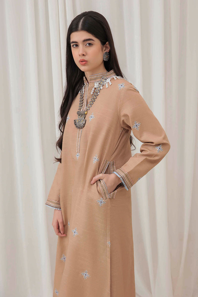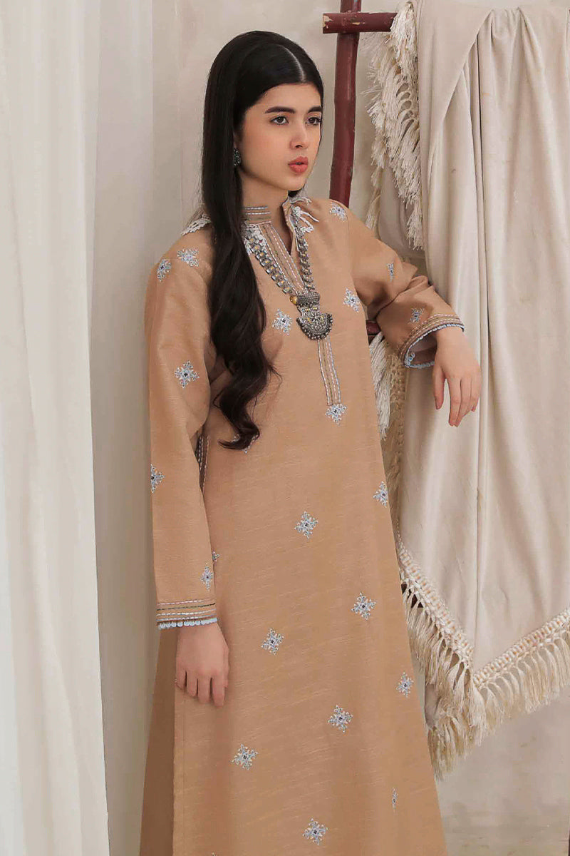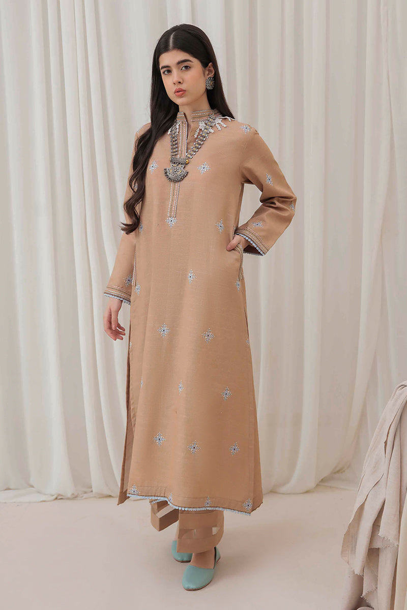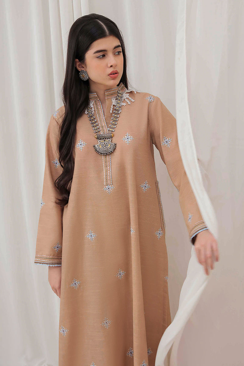 A timeless beige khaddar outfit with delicate embroidered motifs, offering both warmth and sophistication