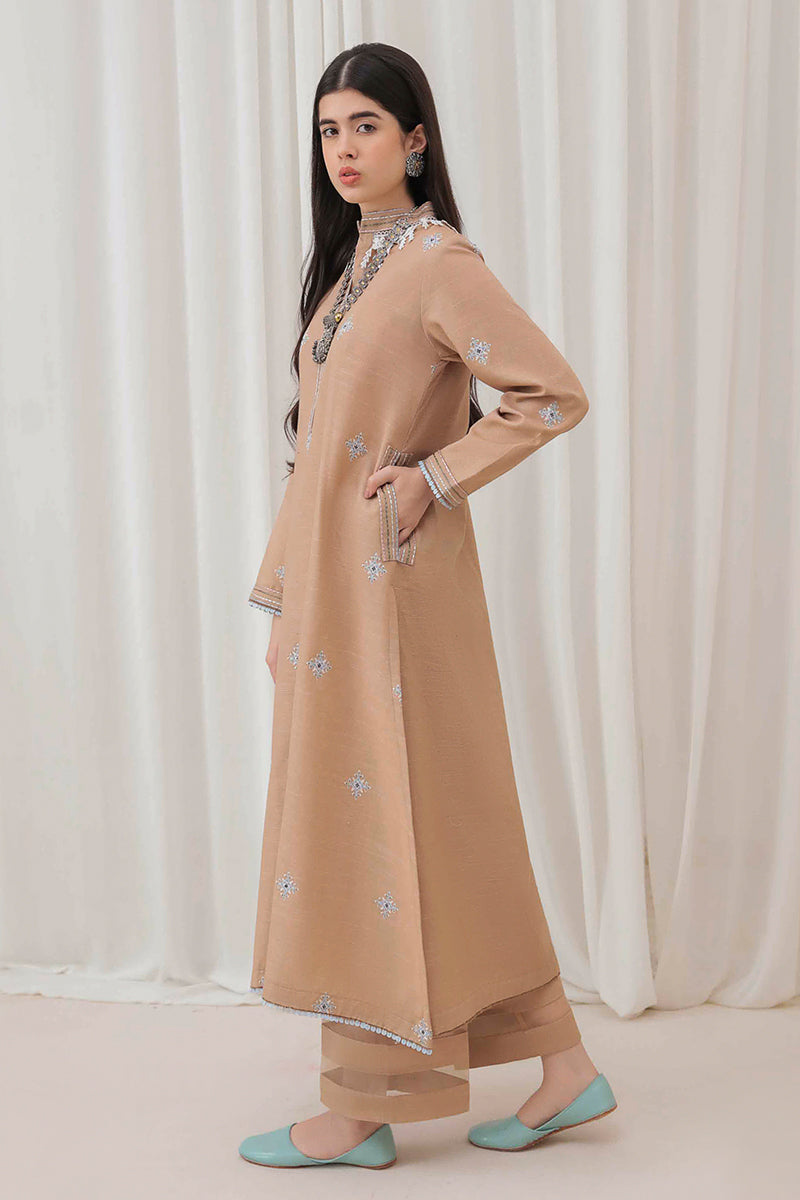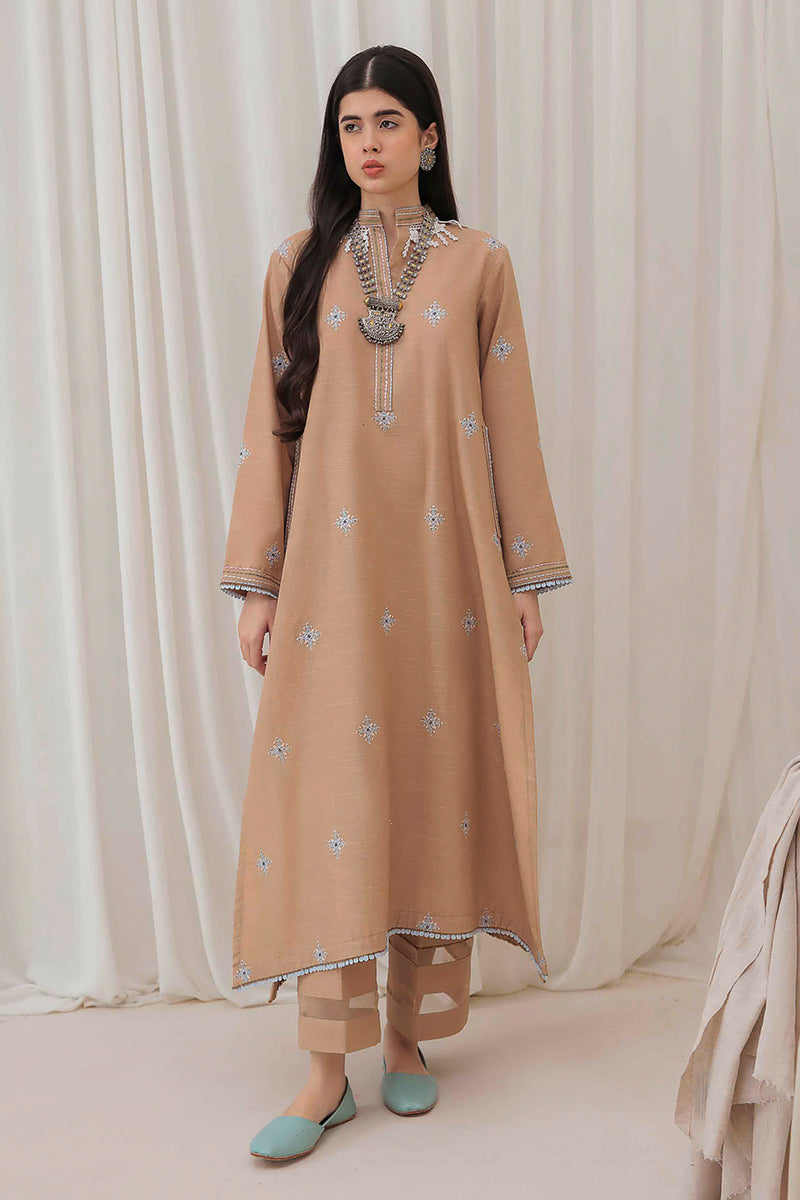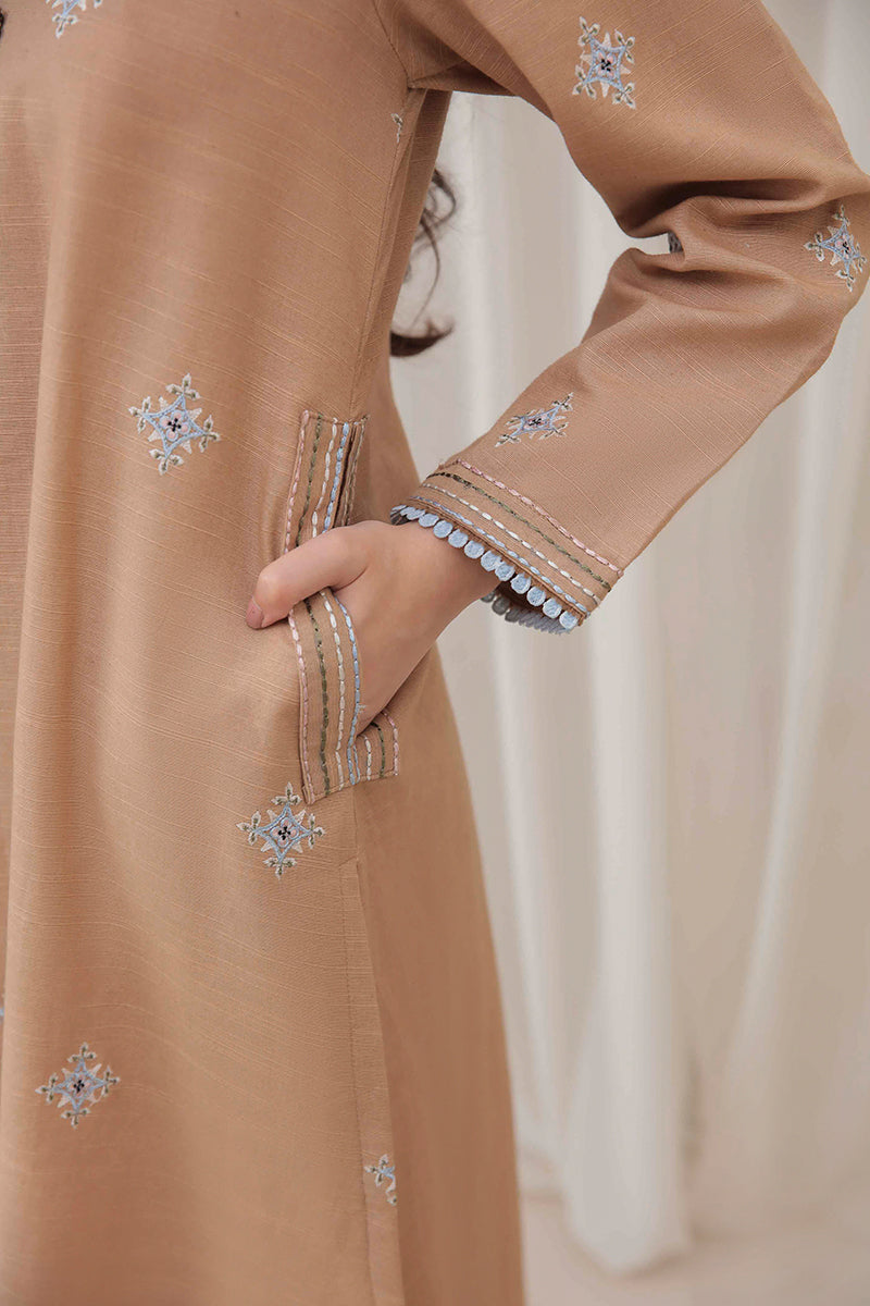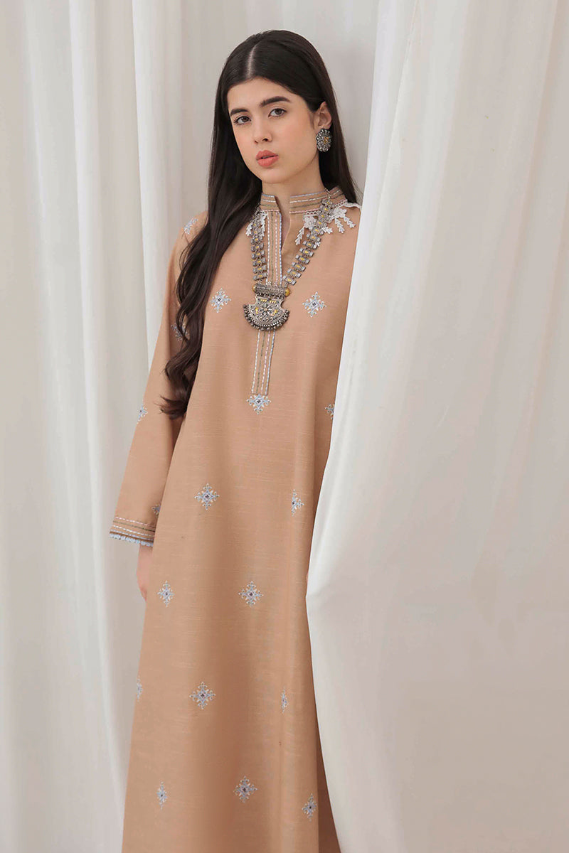 A timeless beige khaddar outfit with delicate embroidered motifs, offering both warmth and sophistication