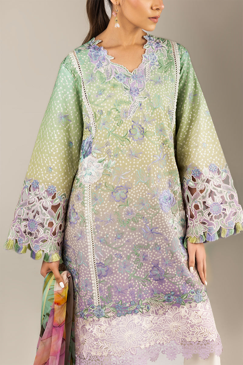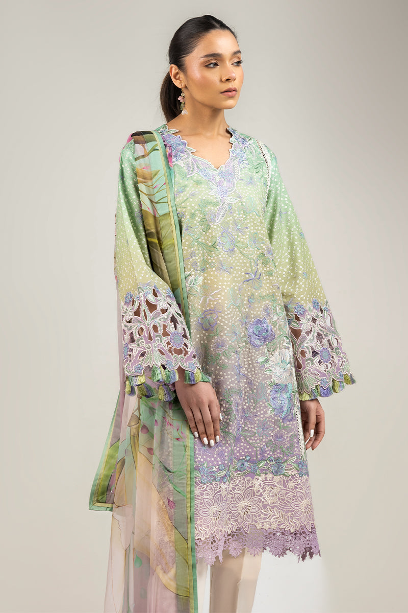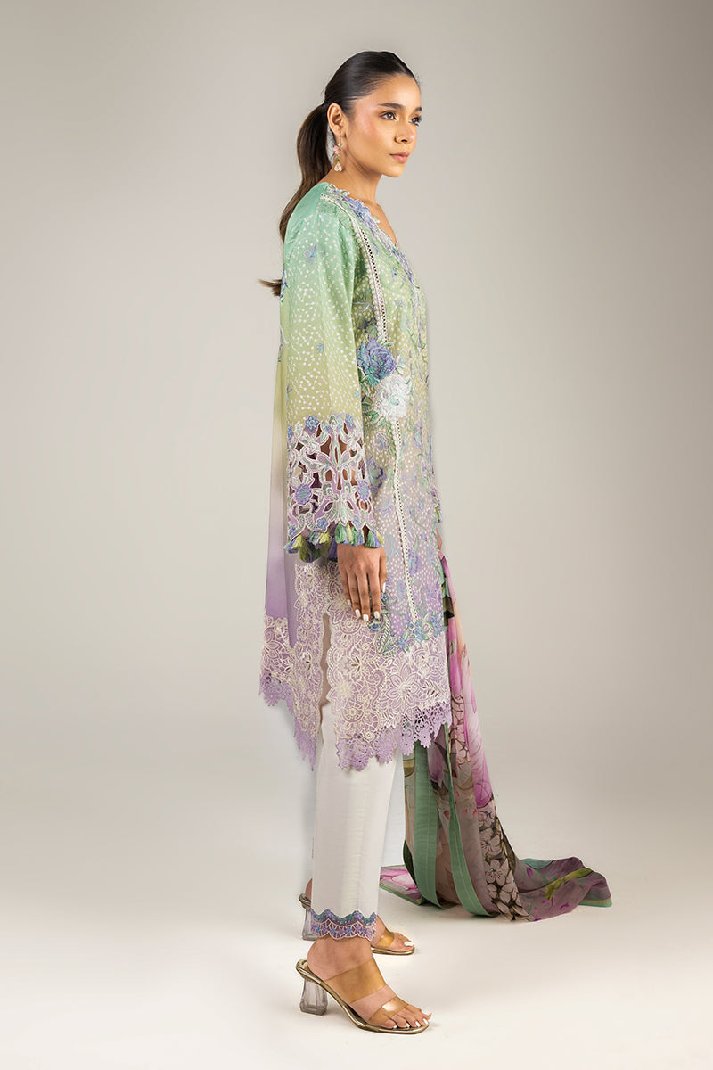 All laces used for finishing of the stitched outfit especially the dupatta or trousers may vary from the shoot.