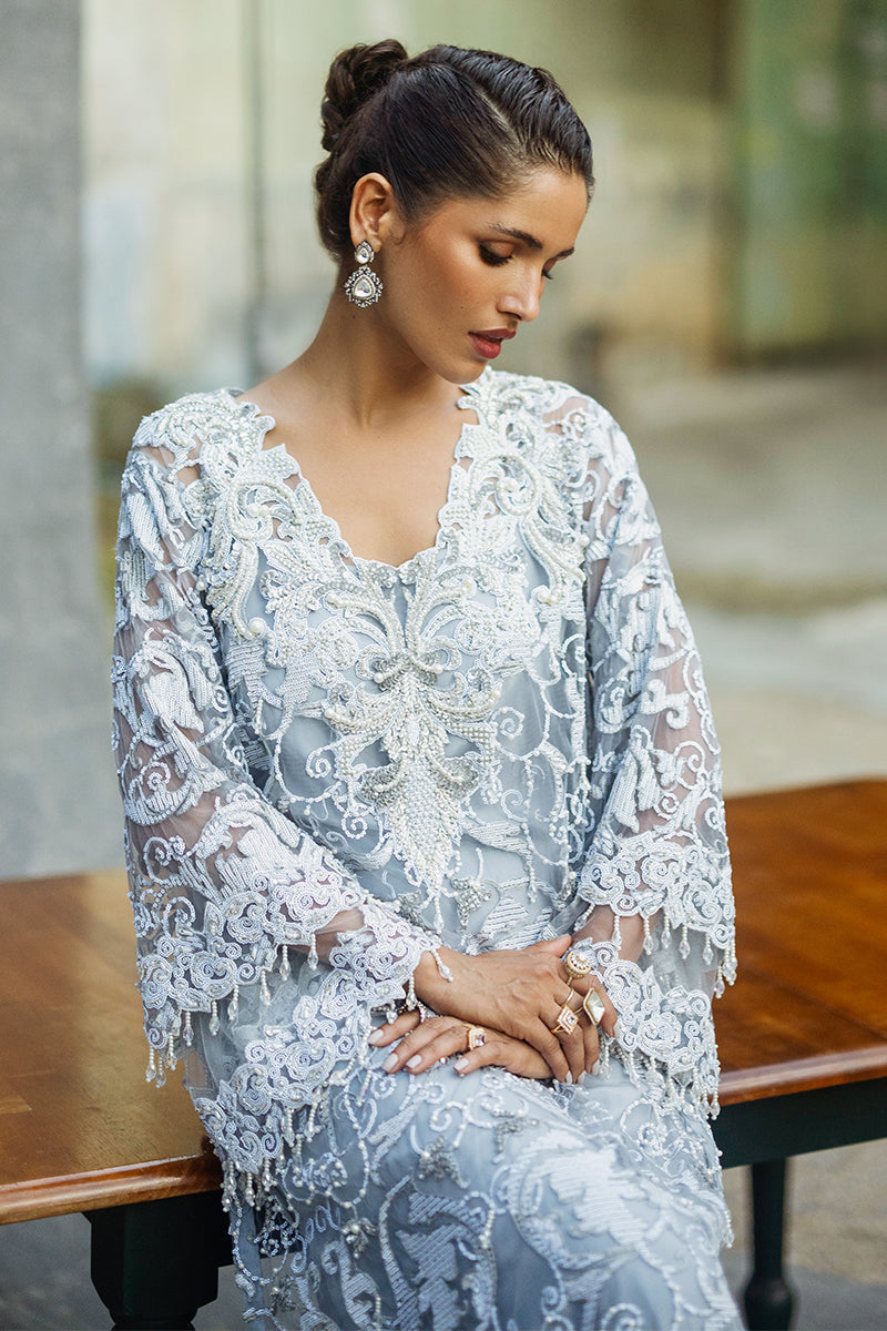 A symphony of elegance and opulence. This stunning design features a meticulously embroidered net shirt, complemented by luxurious raw silk trousers. Paired with a diaphanous organza dupatta adorned with intricate embellishments, Iris exudes sophistication and charm. The perfect choice for making a bold yet graceful statement this season.