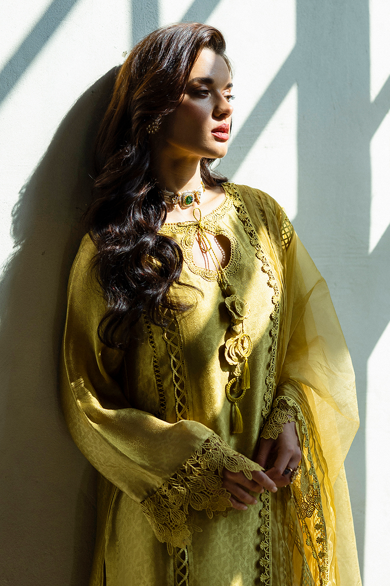Jules - a stunning ode to timeless elegance. Drenched in a sophisticated olive hue, this ensemble is designed for those who appreciate understated luxury. The jacquard fabric shirt boasts exquisite intricate detailing, adding depth and texture to your festive look. A BM organza dupatta cascades effortlessly, infusing the ensemble with ethereal charm. Raw silk trousers provide a structured yet graceful finish, ensuring a refined silhouette. Lined with a silk inner, offering unmatched comfort and a seamless drape.