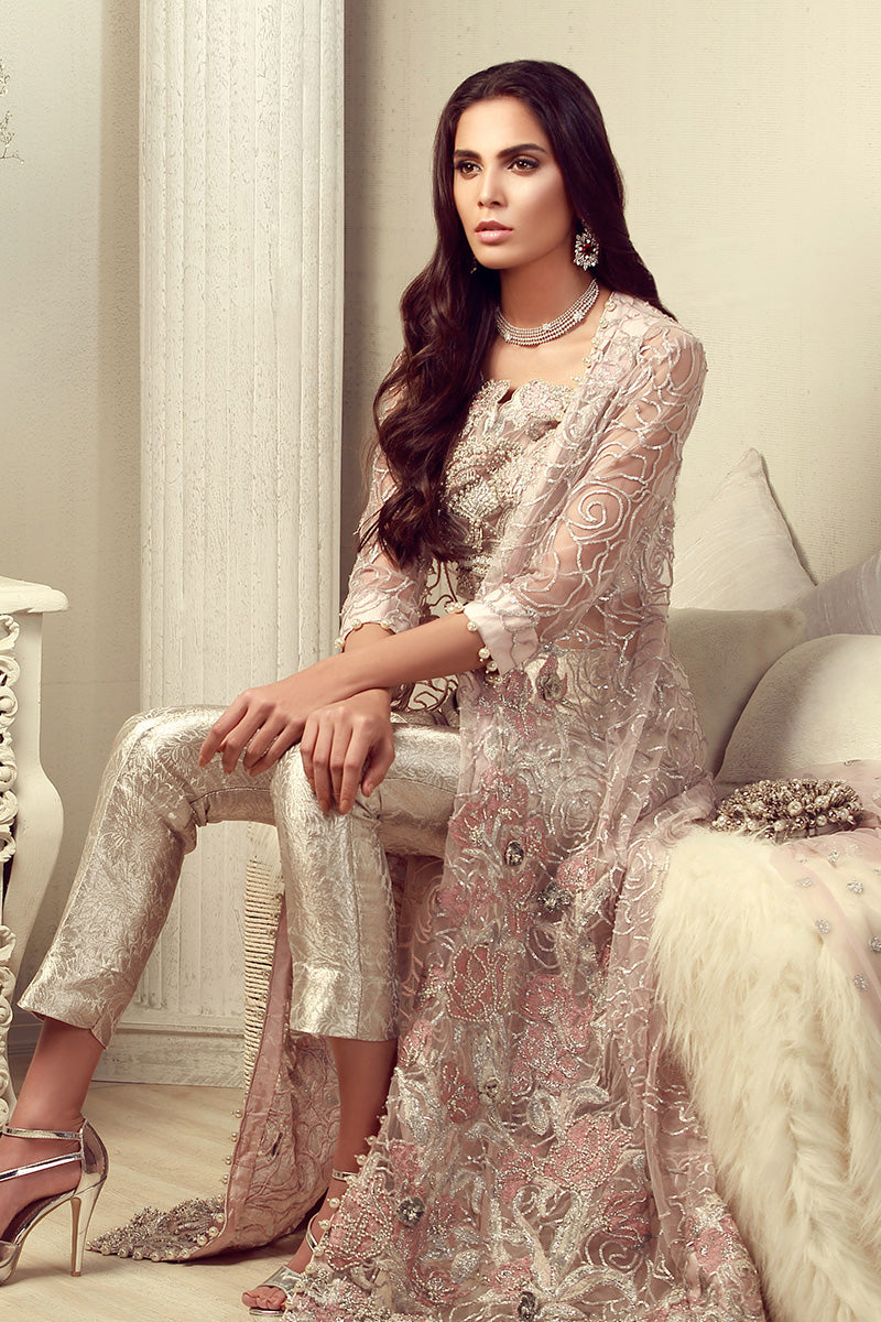 This long open jacket on fine tulle fabric comes with a short shirt and a jamawar lehnga. The shirt and jacket are delicately hand embellished with swarovski, pearls, naqshi, dabka and stones,