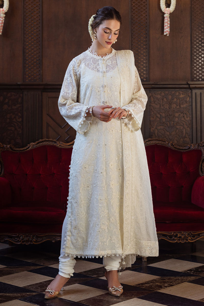 Discover elegance in our exquisitely curated ensemble Ladan. Featuring a raw silk shalwar and a chikankari embroidered shirt with a light sequins spray. The look is further accentuated with a milky lace on the neckline, sleeves, and borders. The khadi net dupatta, embellished with chikankari embroidery and pearl tassels, perfectly complements the refined look. This is a 3 pc outfit.
