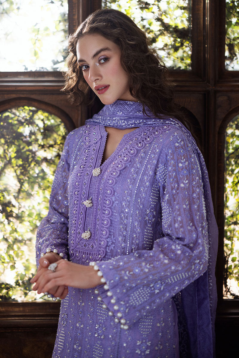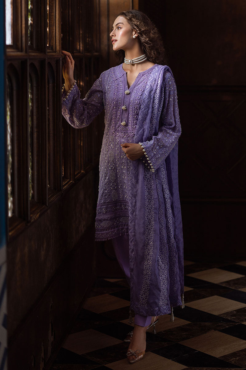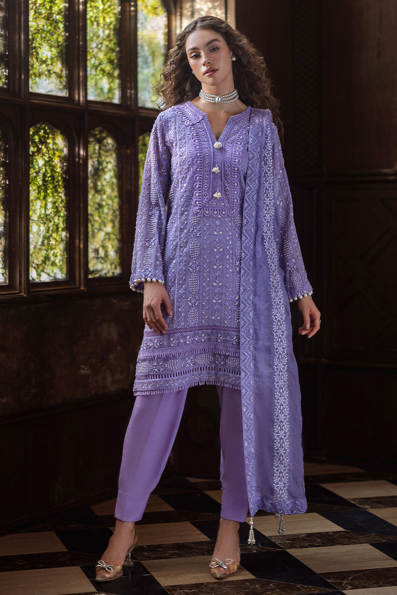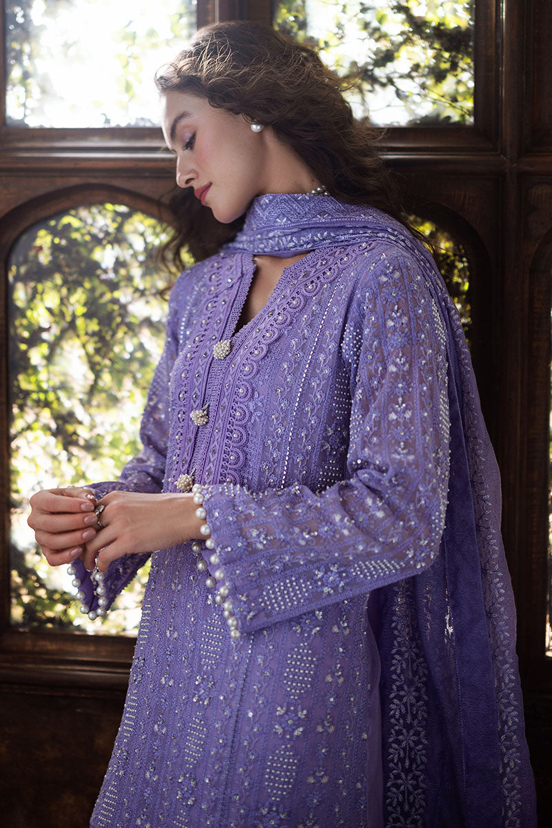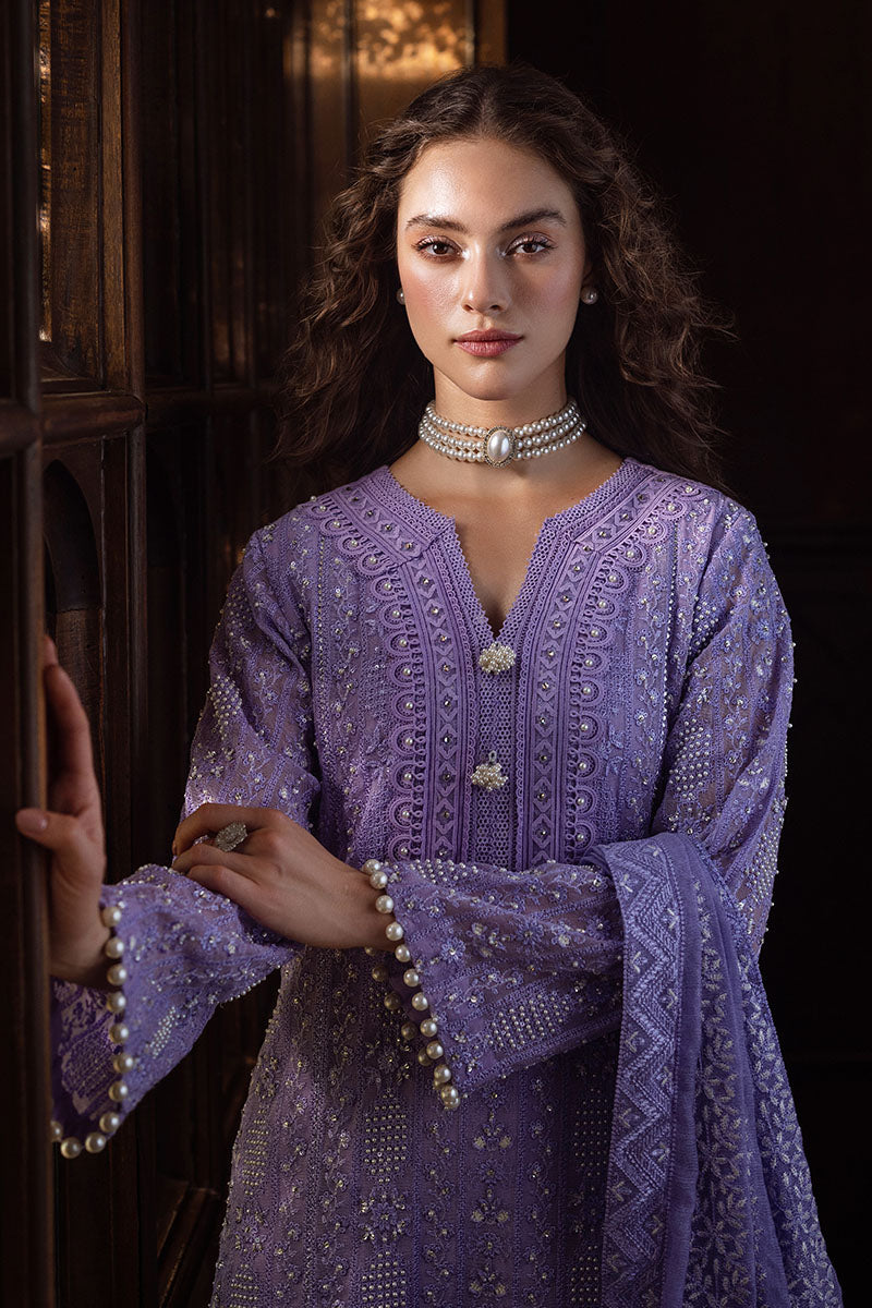 Experience elegance with our exquisitely curated ensemble, featuring a raw silk shalwar and a chikankari embroidered shirt adorned with light sequins, pearl embellishments, and pearl sleeve buttons. The shirt is enhanced with lace insertion on the borders, and the dupatta completes the look with four-sided chikankari borders and pearl hanging tassels. This is a 3 pc outfit.
