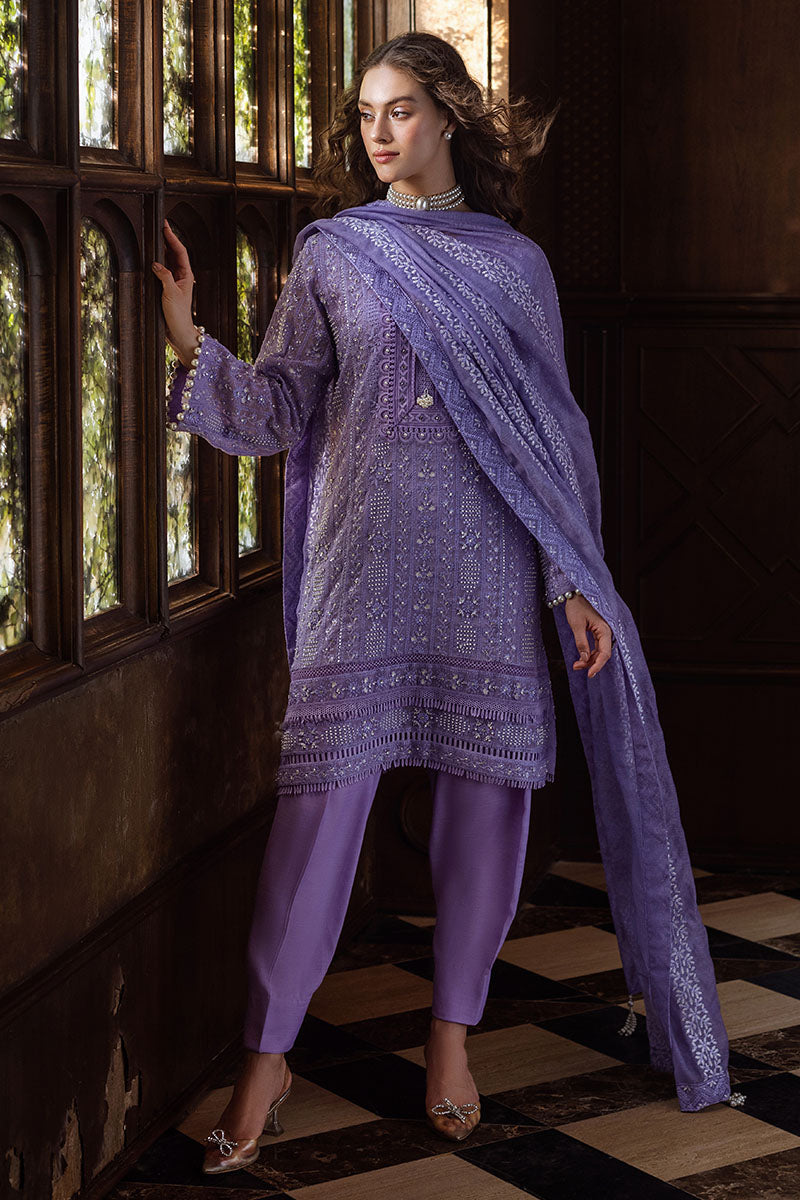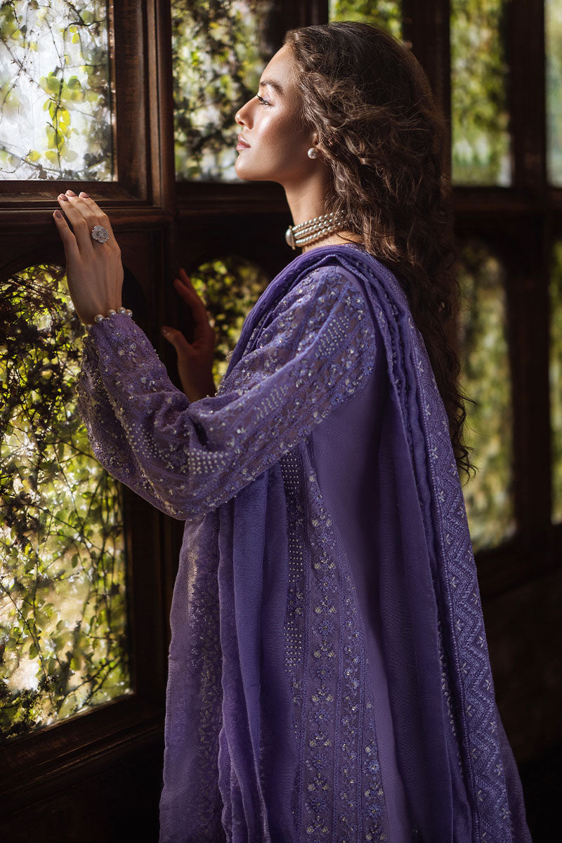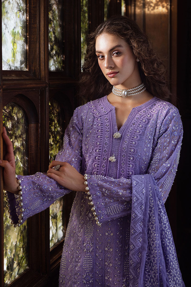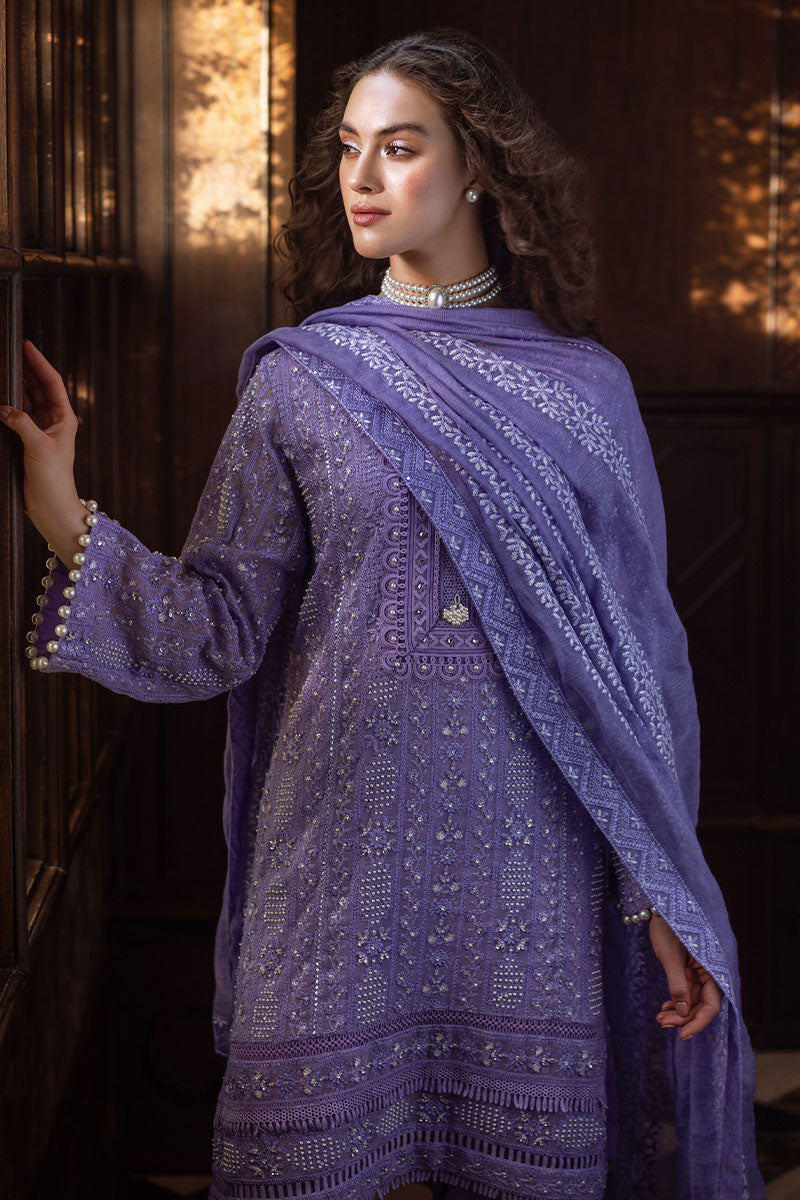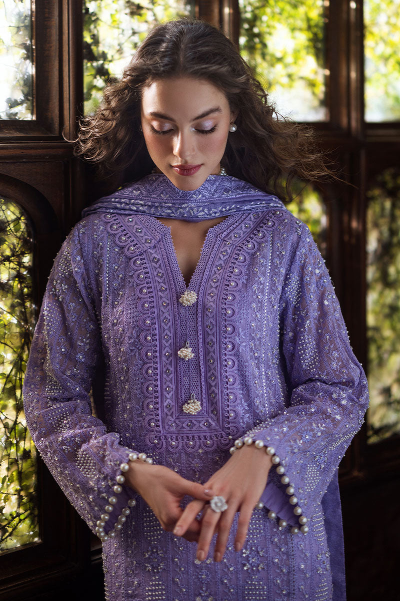 Experience elegance with our exquisitely curated ensemble, featuring a raw silk shalwar and a chikankari embroidered shirt adorned with light sequins, pearl embellishments, and pearl sleeve buttons. The shirt is enhanced with lace insertion on the borders, and the dupatta completes the look with four-sided chikankari borders and pearl hanging tassels. This is a 3 pc outfit.