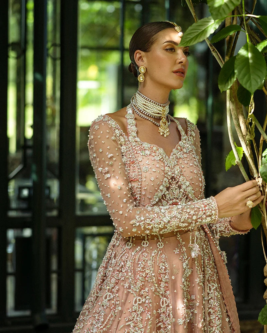 Timeless elegance in peach. A net shirt with intricate dabka, naqshi, and Swarovski crystals, paired with a raw silk lehenga featuring delicate tilla and sequence work. Finished with tassels on the neckline and dupatta.
