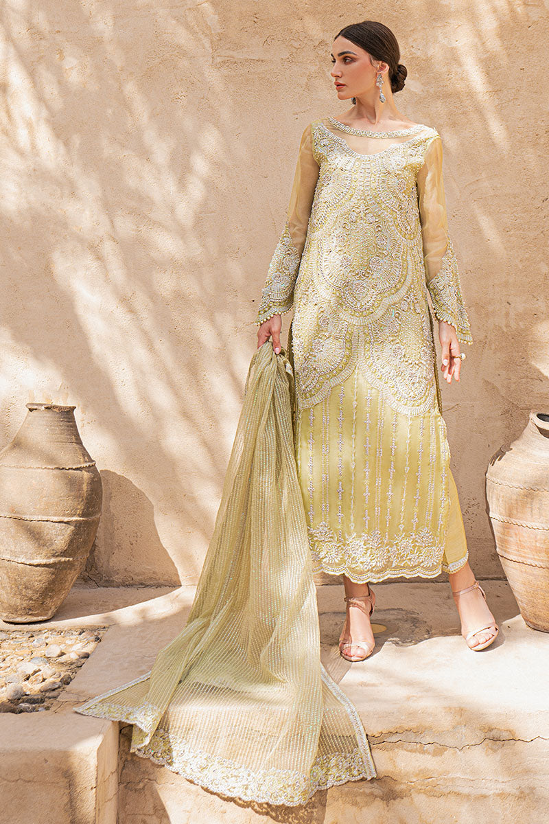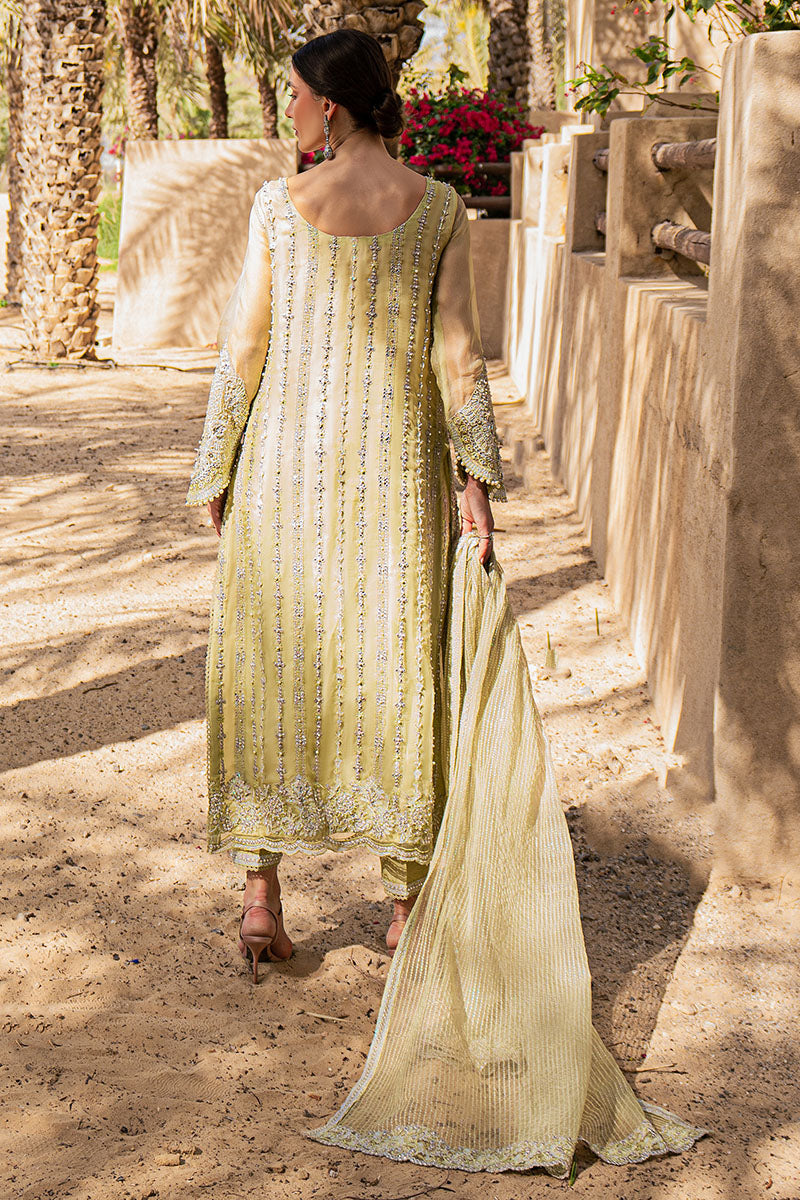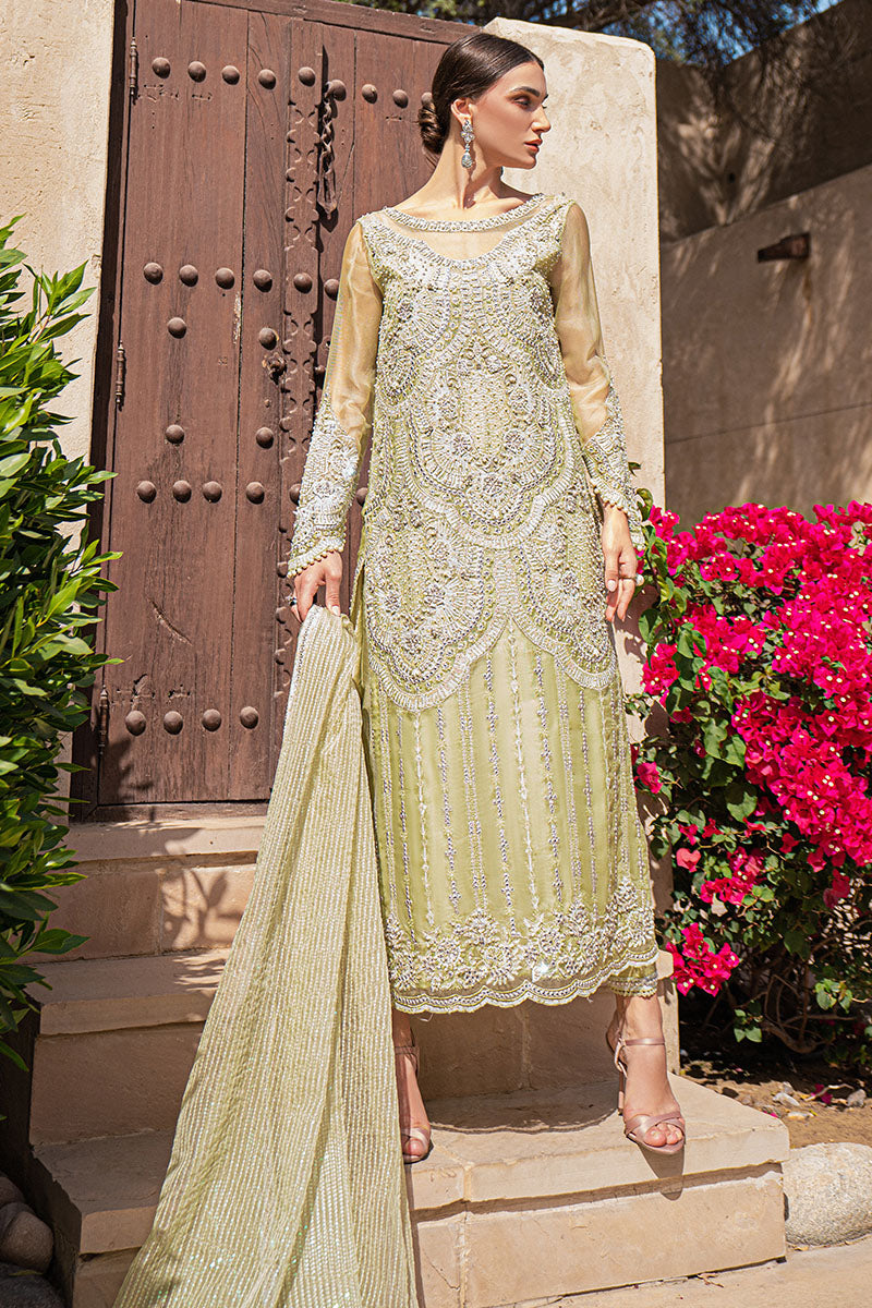 An effortlessly elegant and modern design with heavy handwork all over creates an alluring look in this mellow green pure silk organza net shirt. An all over sequinned dupata is certainly the highlight of Lena.