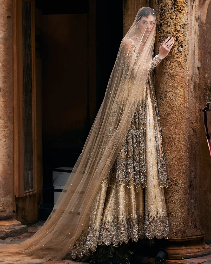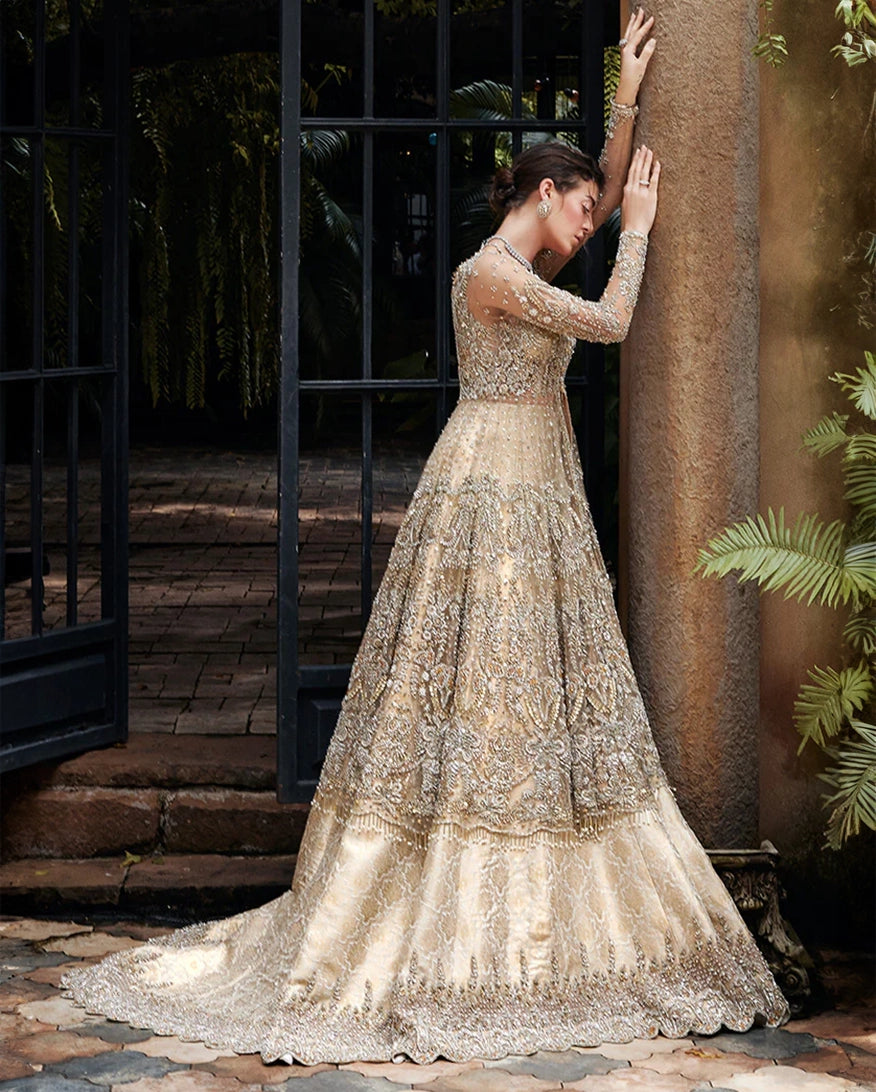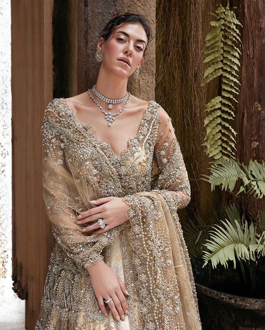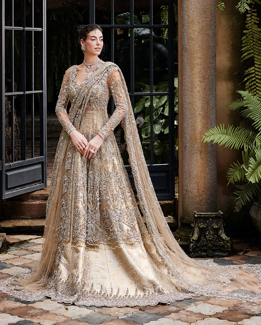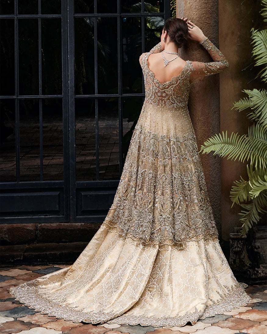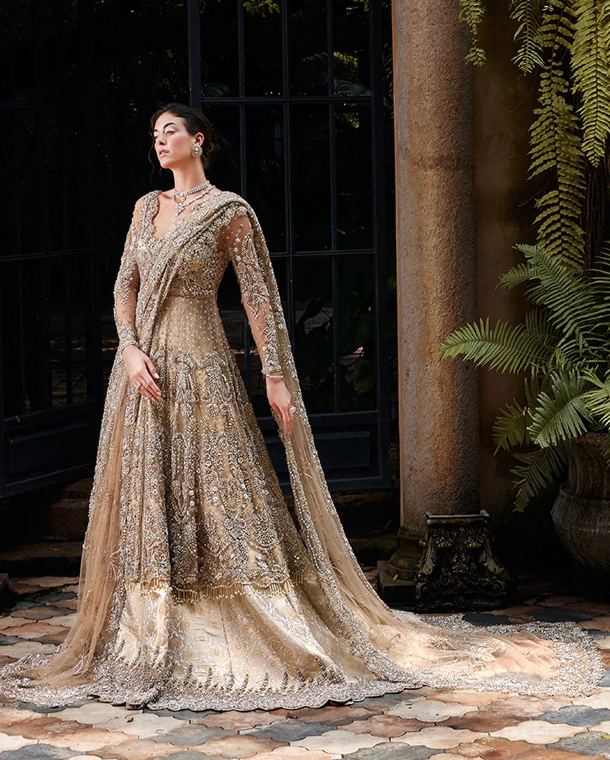 Step into the enchanting world of Leyla, where timeless grace meets contemporary charm. This bridal masterpiece features an ethereal trail of delicate and intricate beadwork, meticulously hand-sewn by our skilled artisans. The opulent embroidery, embellished with shimmering sequins, zardozi, and antique gold thread work, exudes a regal aura. The flowing silhouette and an exquisitely designed neckline add a touch of modern romance, making Leyla a true symbol of sophistication and femininity.
