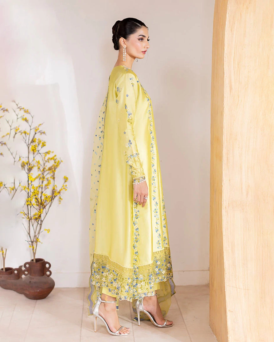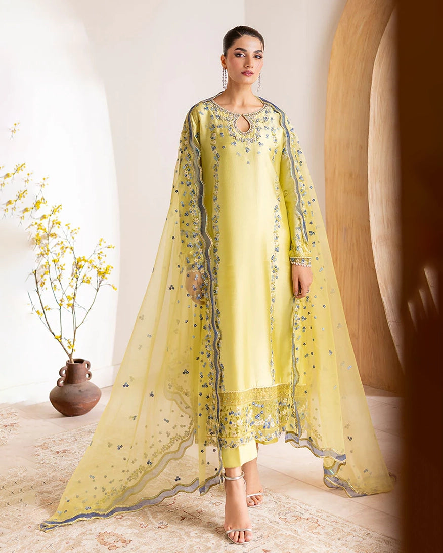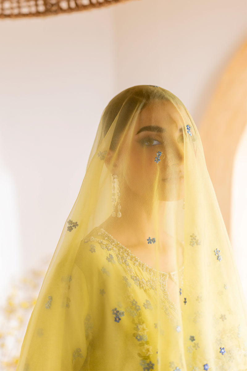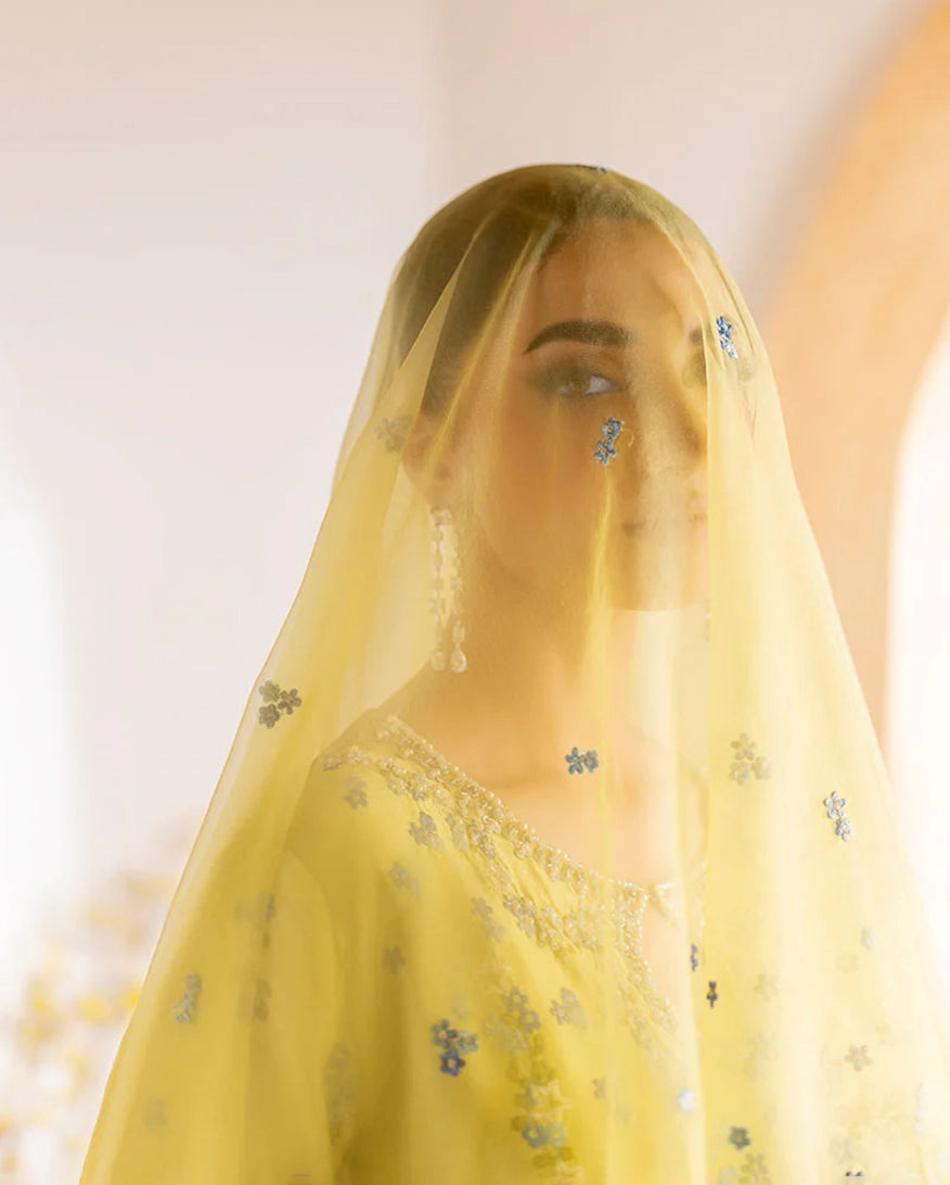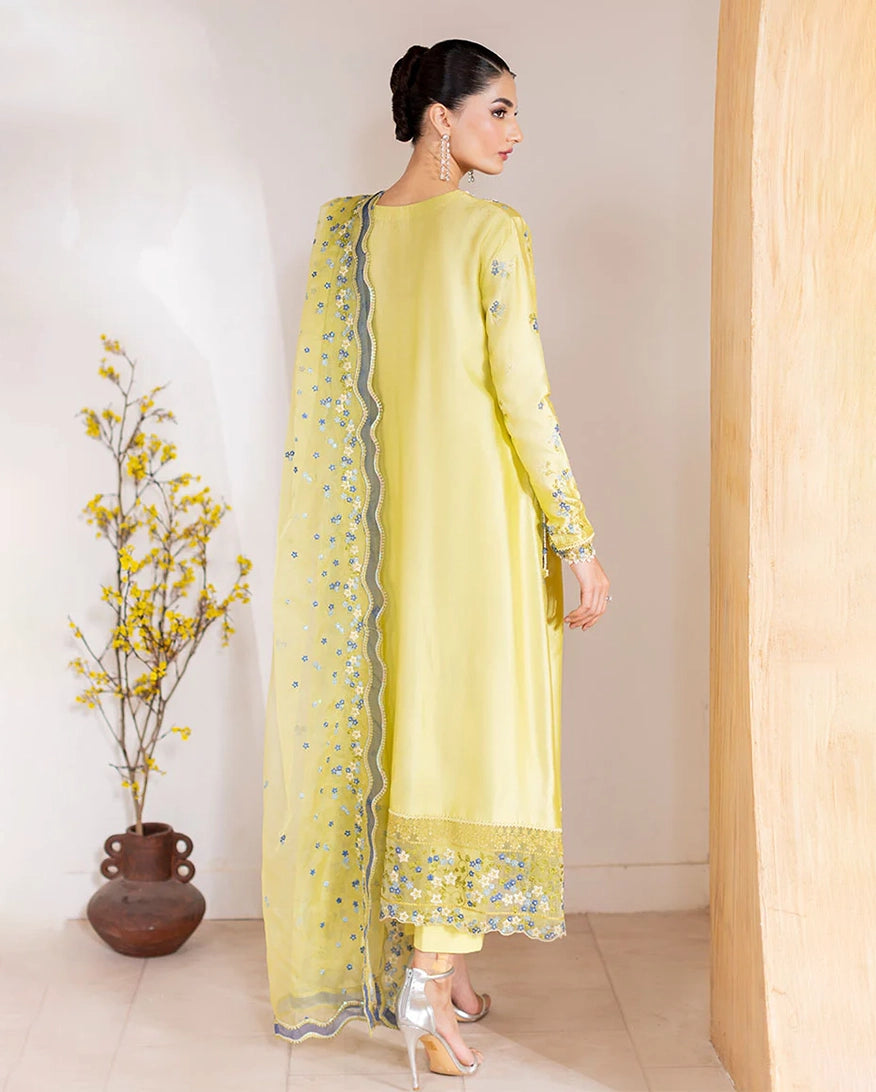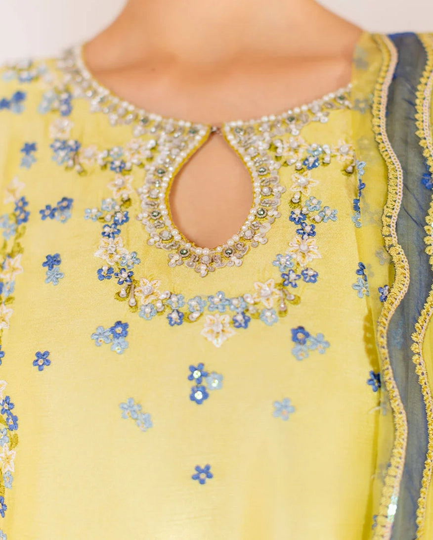 Lumière - A luminous take on festive elegance. Radiating in a fresh lime hue, Lumière features a sheesha silk shirt adorned with intricate floral embroidery and elevated by hand ample pearl and sequin embellishments on the neckline and sleeves - crafted to make an impression with subtle brilliance. Paired with a contrasting organza dupatta, detailed with a scalloped embroidered border and delicate sequin accents, and finished with straight-cut raw silk trousers for a graceful silhouette. Vibrant. Refined. Unmistakably luminous.