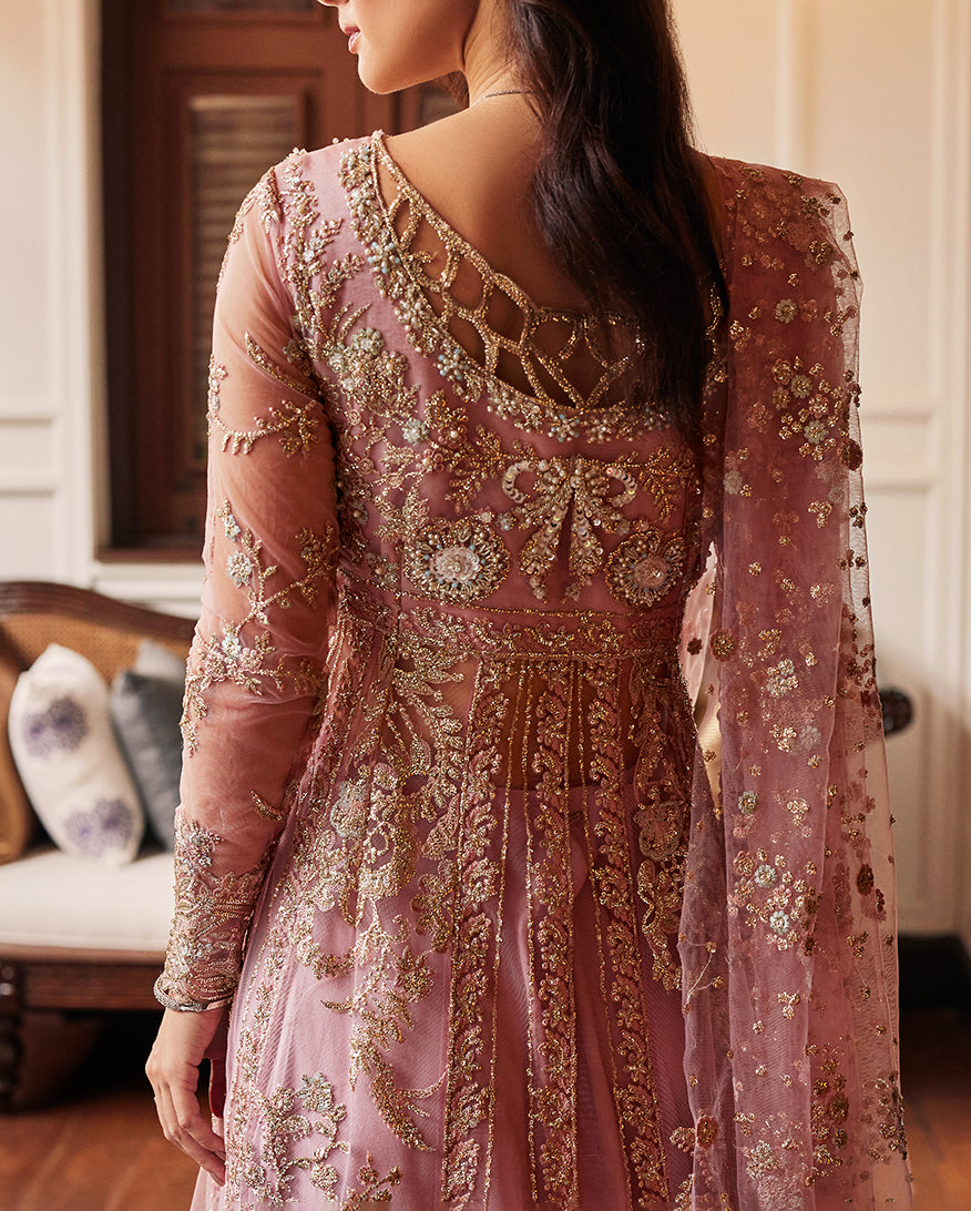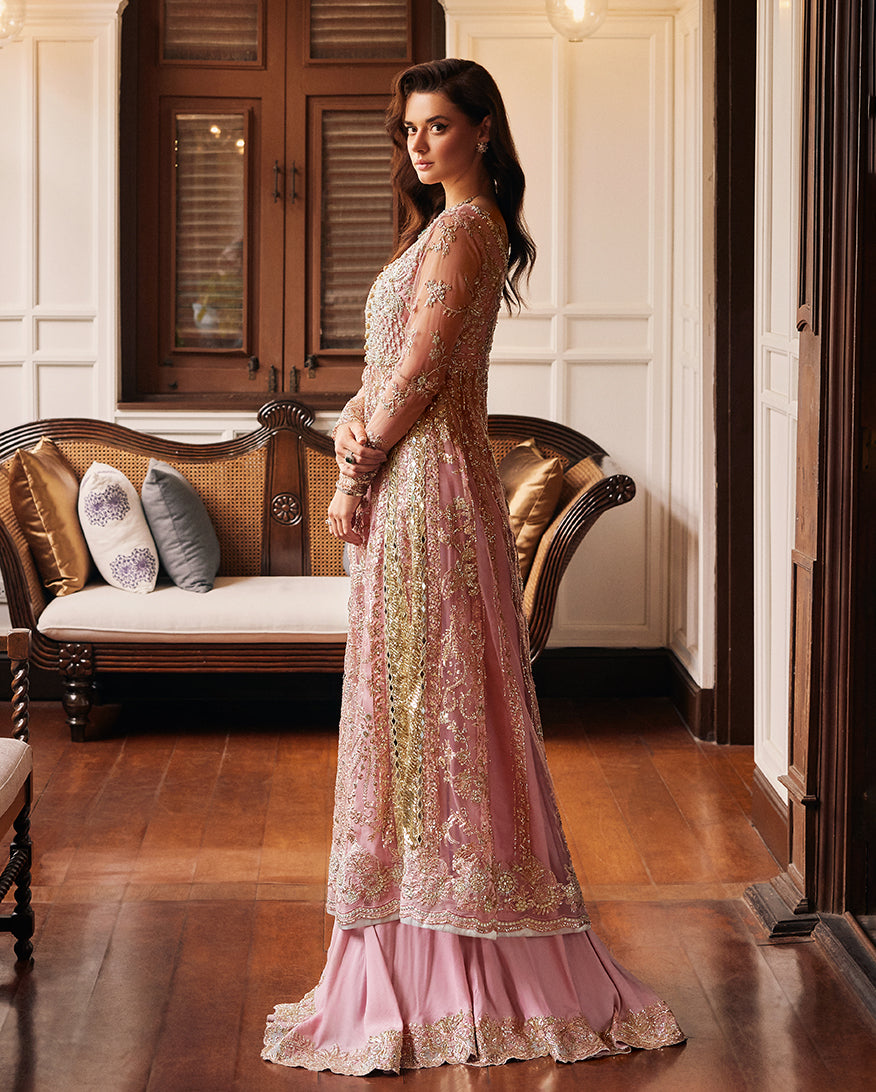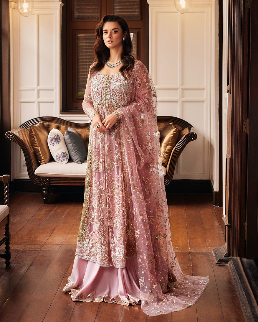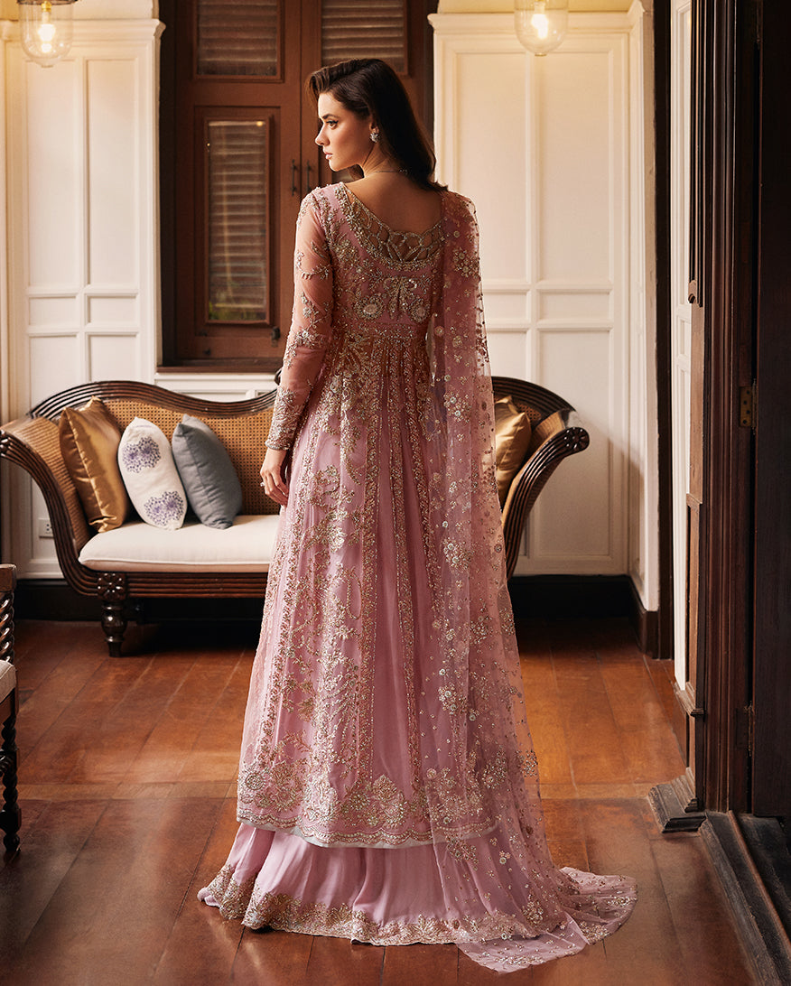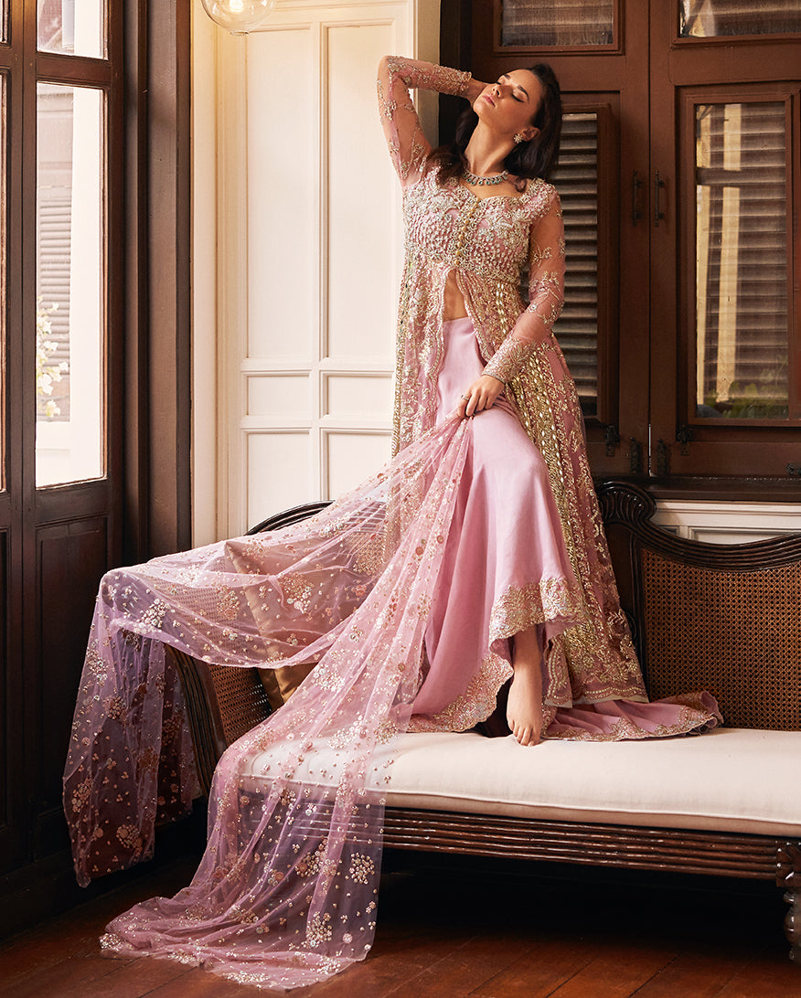 Adorn yourself in the epitome of grace with this enchanting ensemble. A radiant pink attire, intricately hand-embellished with shimmering sequins, exudes opulence and elegance. Paired flawlessly with a sequinned net dupatta, casting a celestial glow, and a dyed raw silk sharara, this ensemble captures sophistication and allure, celebrating a harmonious blend of tradition and modern glamour