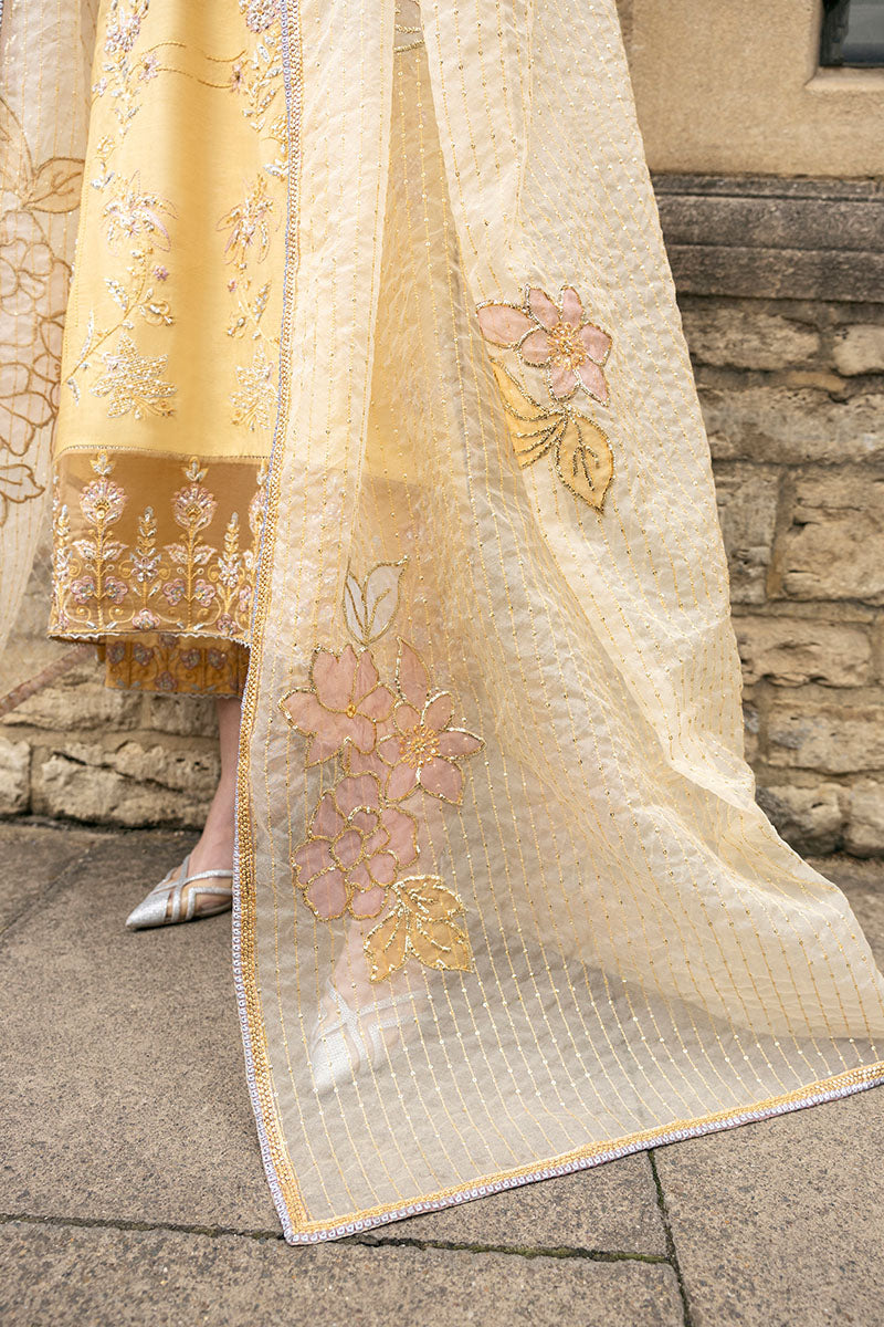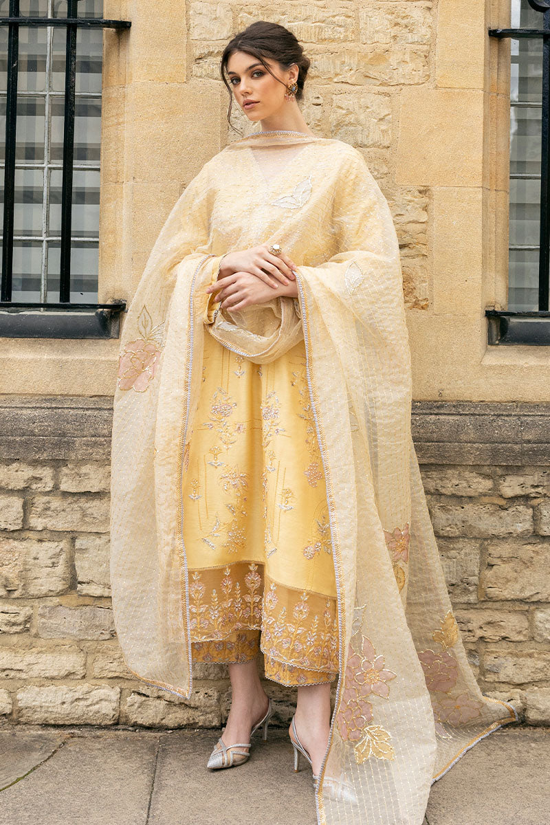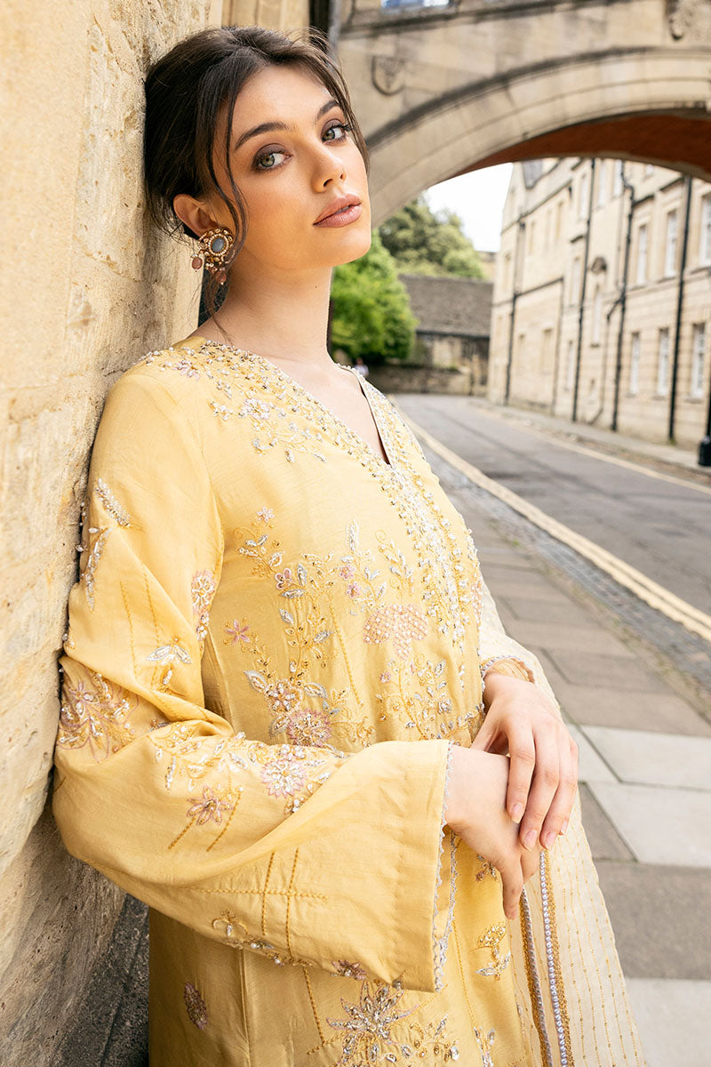 Experience timeless elegance with this shirt featuring pure resham embroidery, hand-embellished with Swarovski crystals, tilla, dabka, and naqshi gemstones. Finished with delicate laces on the daman and hem, it pairs seamlessly with hand-embellished pants for a sophisticated, cohesive look. The look is complete with a dupatta featuring embroidered border with tilla laces and sequins spray with applique on the borders.