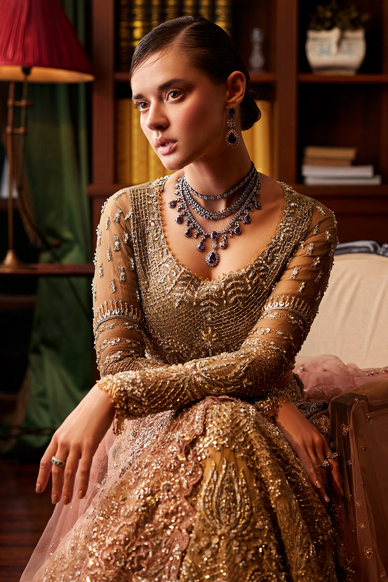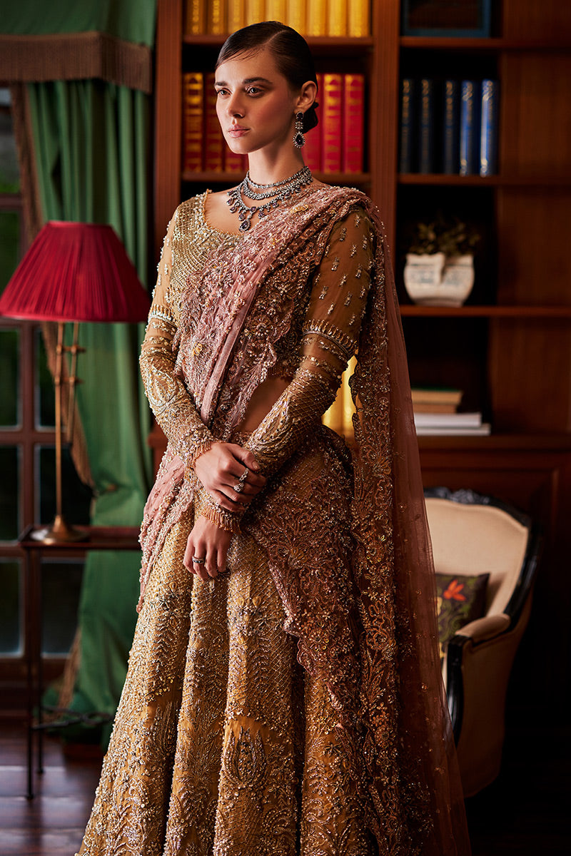 Prepare to be enchanted by Lysandra, a manifestation of timeless elegance and opulent detailing. This bridal ensemble features a hand-embroidered embellished details, accentuated by clusters of naqshi, sequins and Swarovski crystals. The flowing silhouette, crafted from layers of soft silk organza, adds a touch of ethereal grace. Lysandra is a tribute to the bride who appreciates intricate craftsmanship and desires a look that is both classic and contemporary.