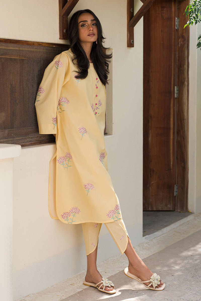 A captivating ensemble in a radiant light yellow hue, adorned with exquisite embroidered details on a solid canvas. This outfit combines the vibrant charm of the color yellow with the artistry of delicate embroidery, creating a striking visual impact.