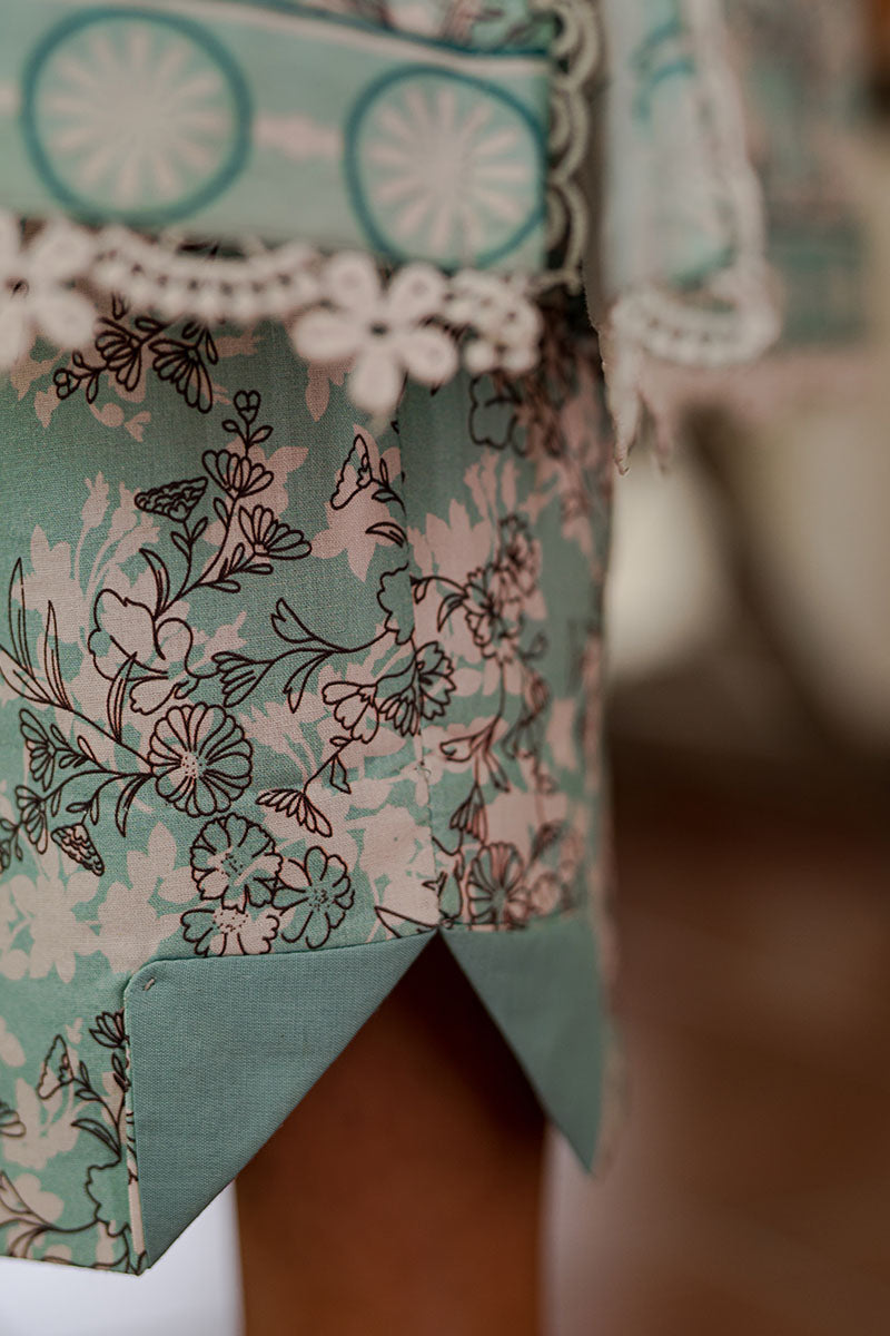 The fabric pattern/laces, patchwork, and handmade details may vary.