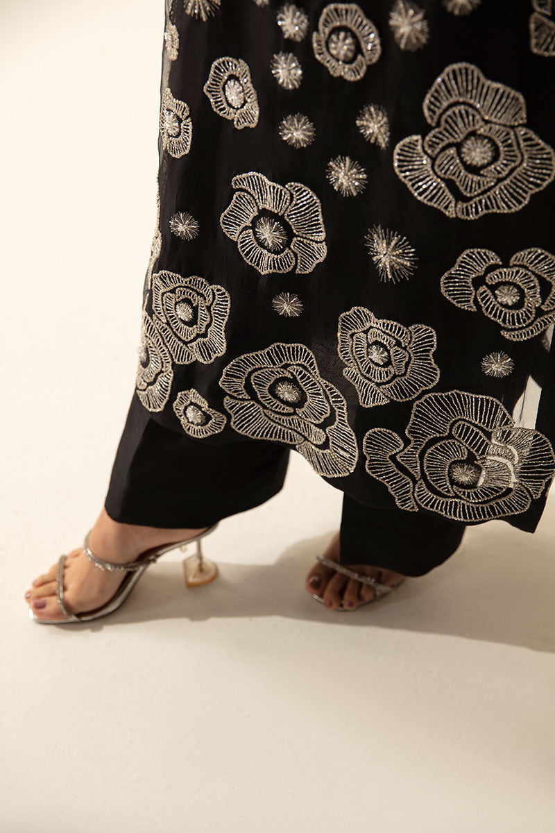 "Manera" in the timeless allure of Black, captivates with its sophistication and modern glamour. This stunning outfit is meticulously adorned with a striking combination of chain, cut dana embroidery, crystals, and swarovski elements, creating an ensemble that is both chic and opulent