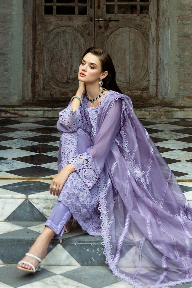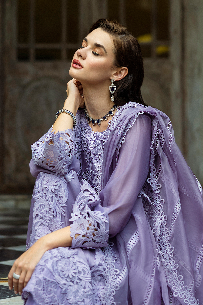 Marienne- is a vision of pure elegance. Drenched in an lavender hue, this ensemble embodies grace, sophistication, and understated luxury perfect for a refined Eid look. The pure Spench silk shirt exudes an effortless sheen, adorned with intricate detailing for a touch of opulence. A delicate BM organza dupatta drapes beautifully, adding an airy, ethereal charm. Raw silk trousers provide a structured yet fluid silhouette, ensuring a flawless fit. Lined with a silk inner, offering unmatched comfort and a seamless drape.