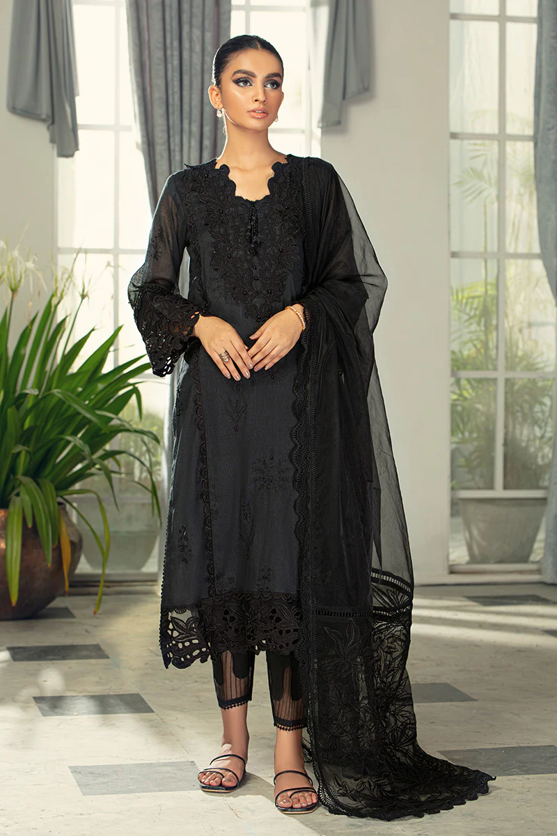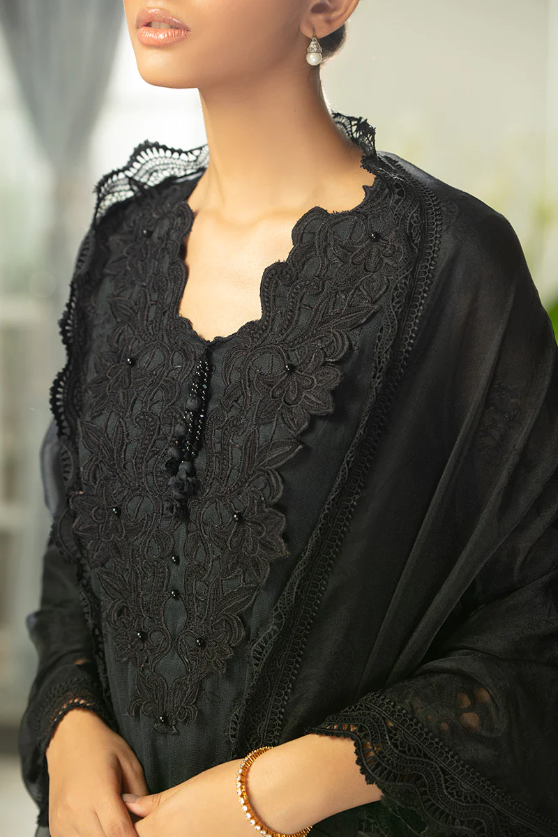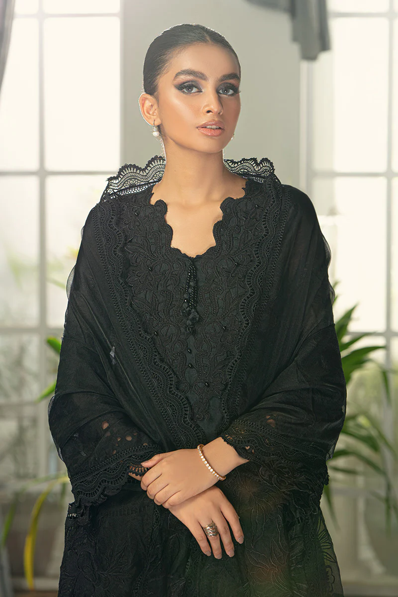 Set on a pure khaddi ebony cotton net base is our next design, "Maya". Intricately embroidered and lightly embellished shirt is finished with a lazer cut border on the hemline and sleeves. It is paired with a monotone pure organza dupata with embroidered borders.