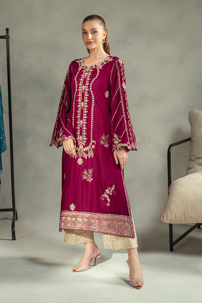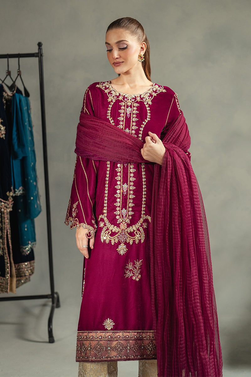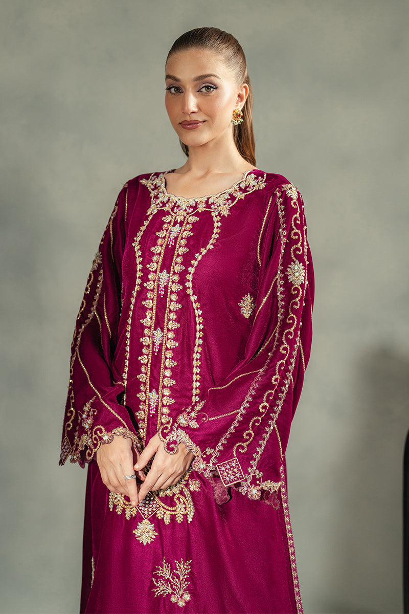 'Mira' ensemble includes a velvet shirt paired with jamawar bottoms and an organza dupatta. Adorned with pearls, bethki, crystals, resham, naqshi, dabka, kora, and sequins, it showcases exquisite craftsmanship. The multi-head embroidery enhances the look with intricate and vibrant detailing.
