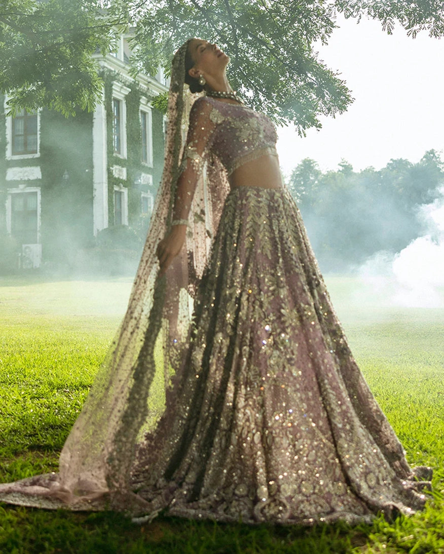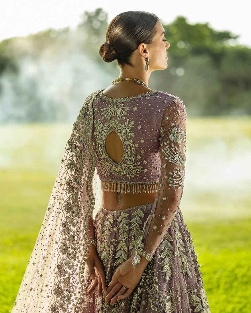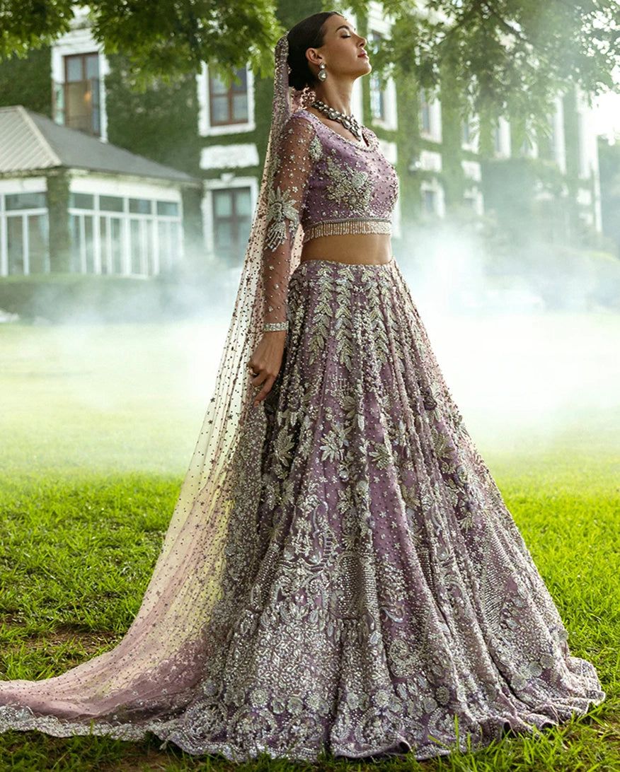 A stunning purple lehenga choli adorned with intricate dabka, naqshi, pearls, and Swarovski crystals, creating a radiant bridal look. The net lehenga features a delicate spray of thread and sequins, adding a soft shimmer to every step.