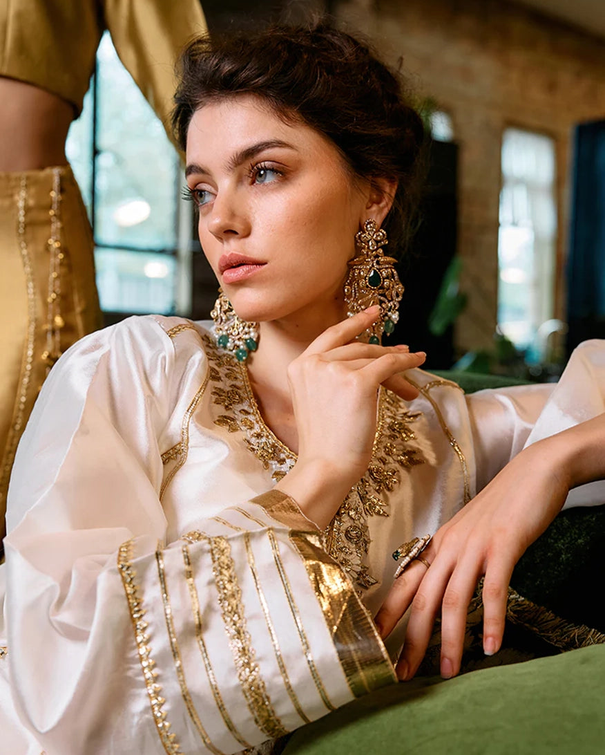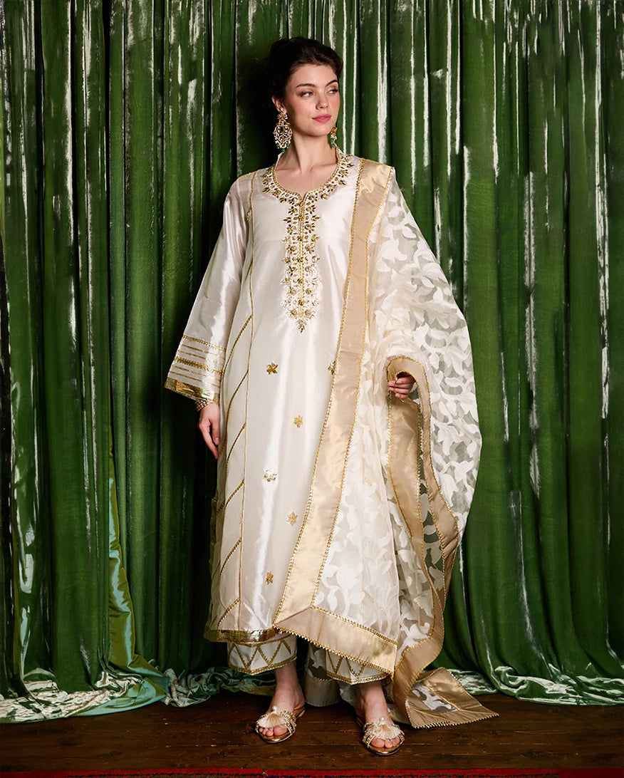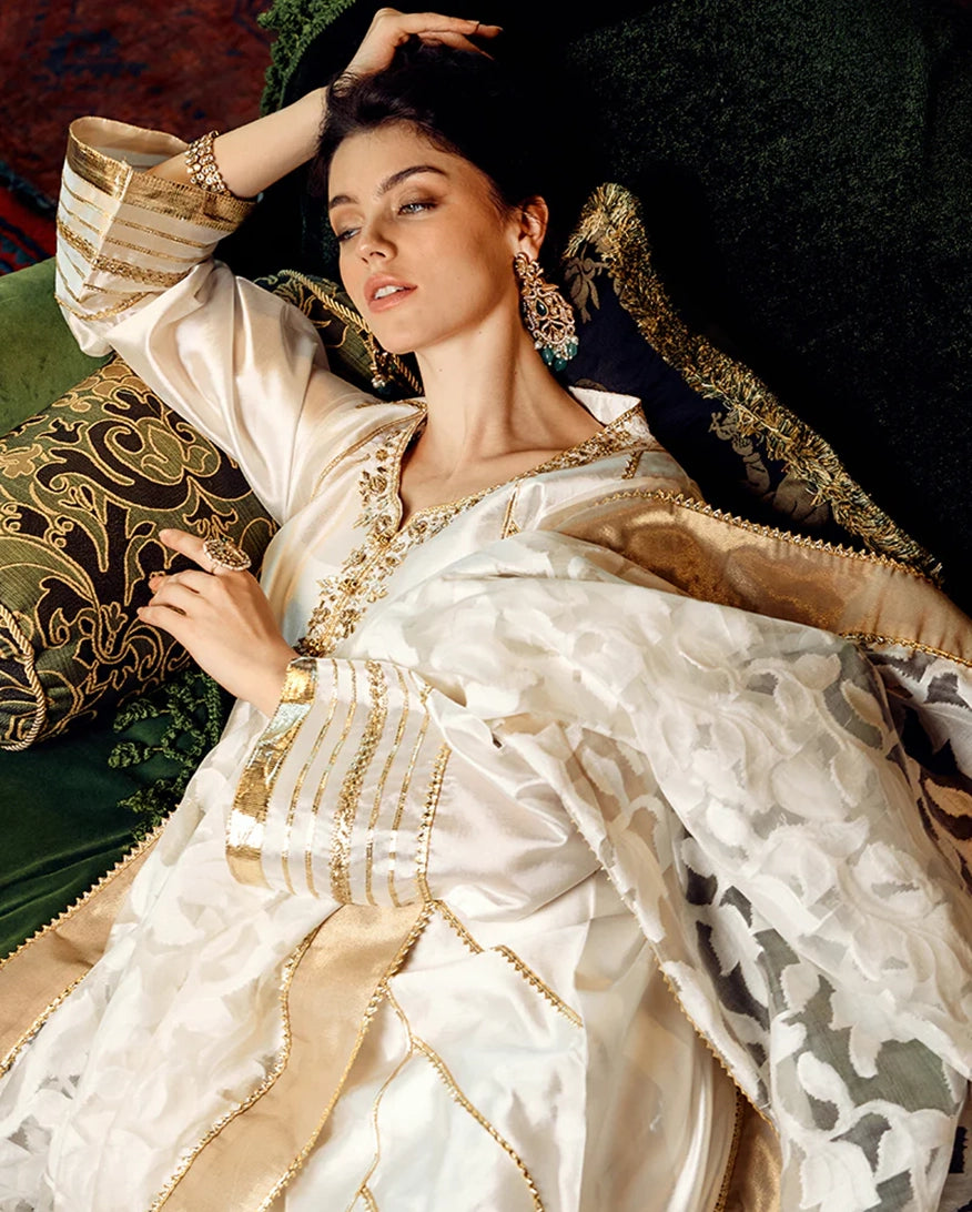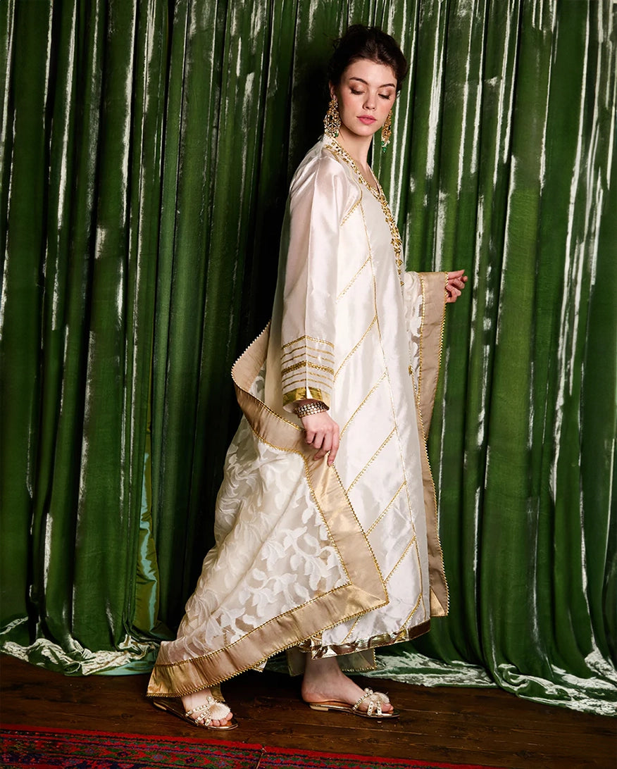 Radiating elegance in white, "Moti" is crafted from luxurious raw silk. A timeless design that embodies grace and sophistication.