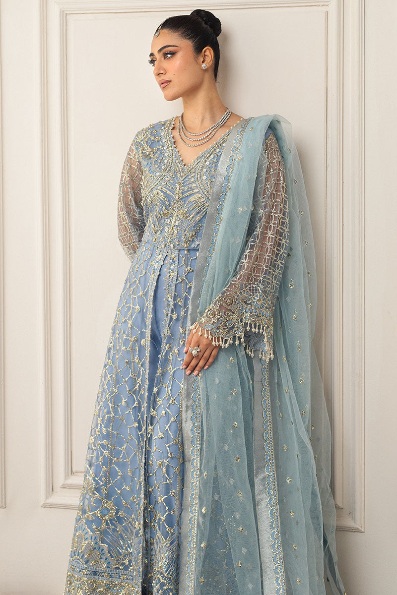 Periwrinkle is a luxurious ensemble featuring intricate embroidery and sequin work across the net front yoke, back yoke, and sleeves, creating a captivating statement. Paired with a richly adorned organza daman border, hand-embellished tassels, and a sequined dupatta, the outfit exudes elegance. Completing the look is a dyed raw silk sharara and delicate pearl finishing, offering timeless sophistication for your special occasions.
