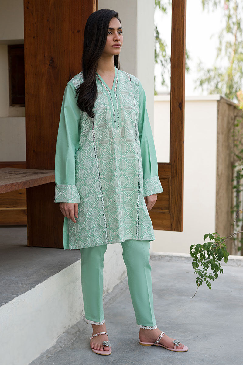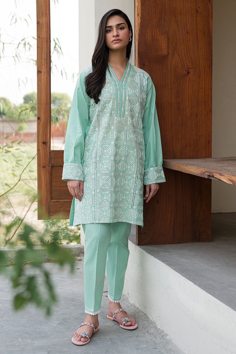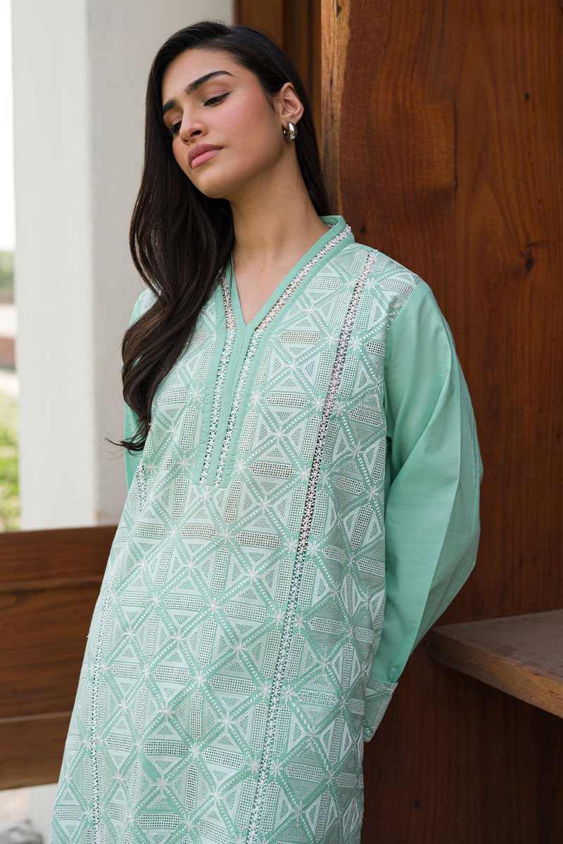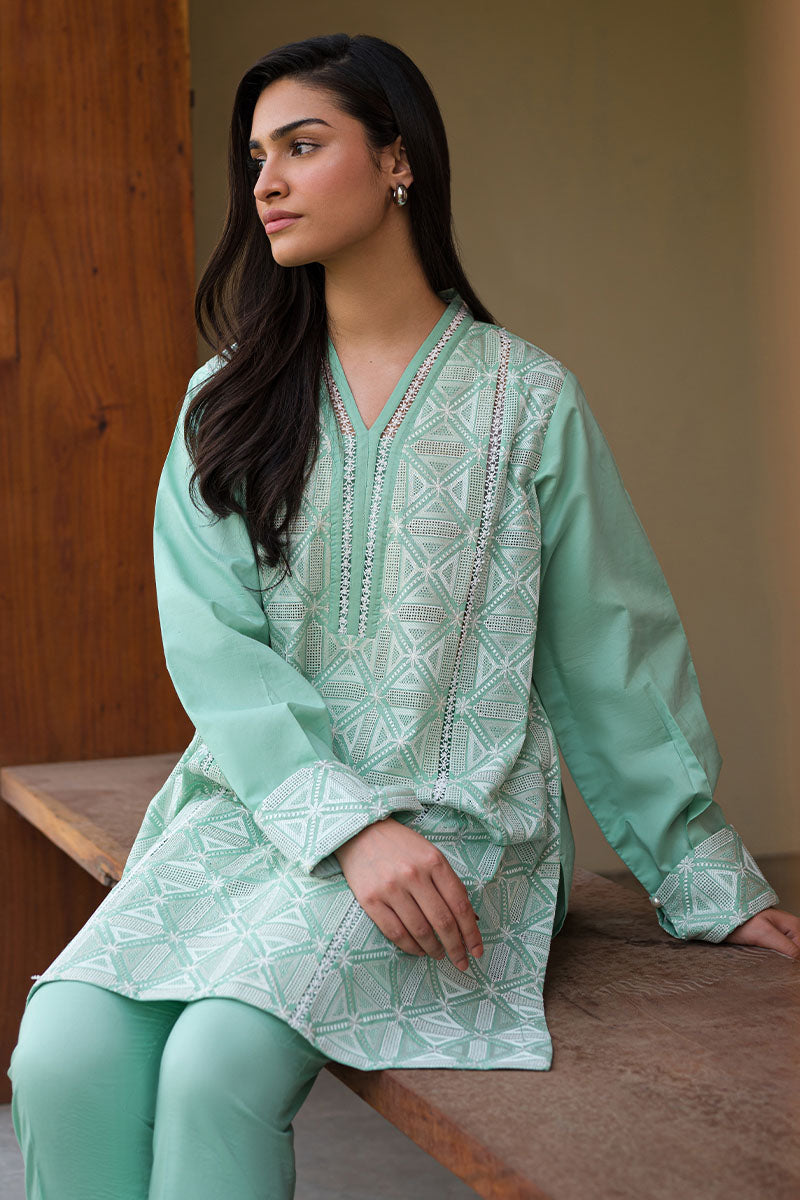 Unveiling a charming ensemble in a serene green hue, accentuated by delicate embroidered details on a solid canvas. This outfit emanates tranquillity and sophistication, with the green color evoking a sense of serenity and ethereal beauty. The intricate embroidery on the solid canvas adds an element of exquisite artistry, enhancing the overall allure of the ensemble.