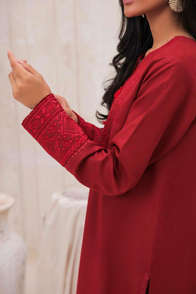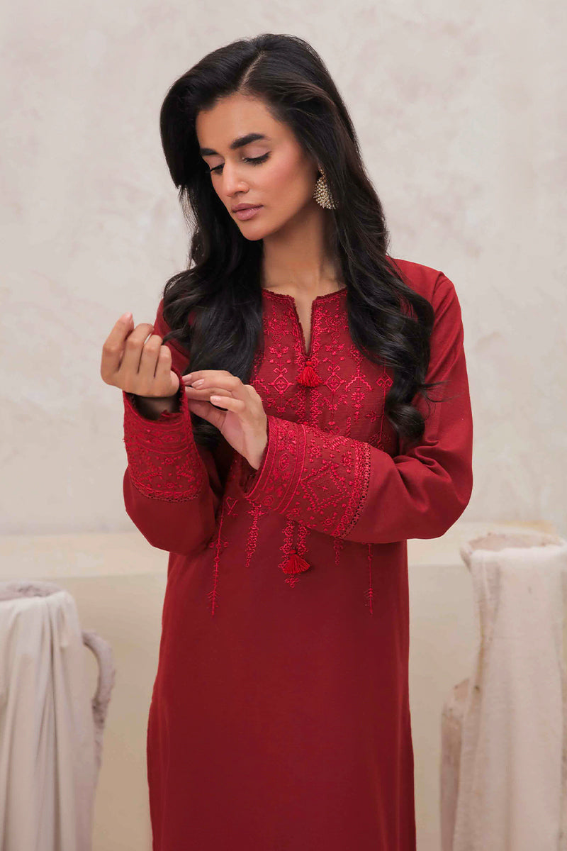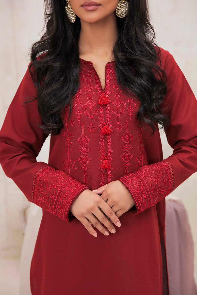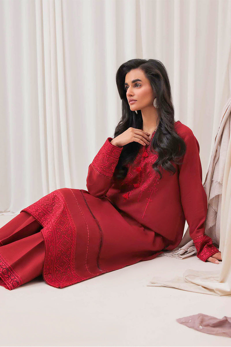 This vibrant red khaddar ensemble, adorned with elegant embroidered motifs, is designed to capture attention. A bold and beautiful choice to bring warmth and style to your winter days!