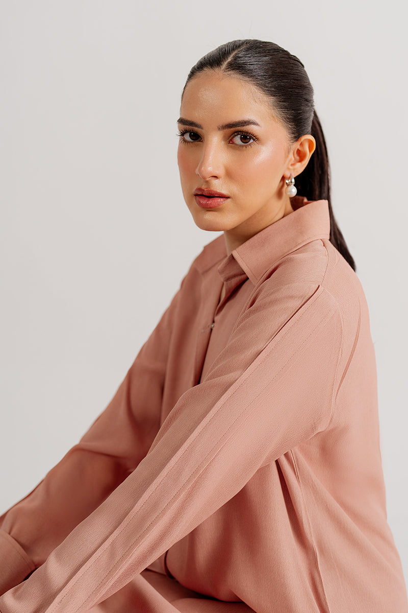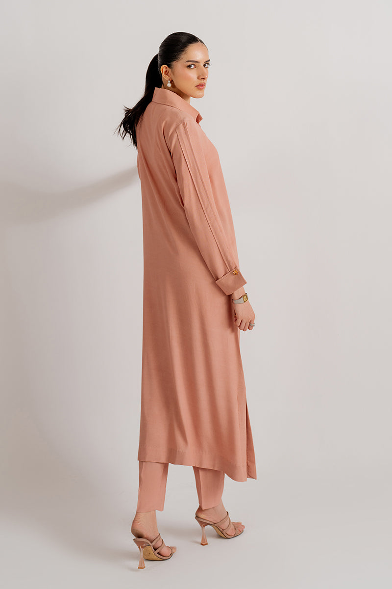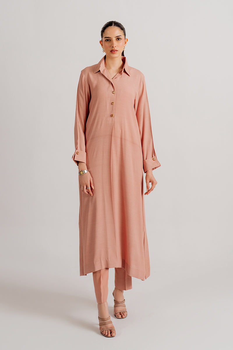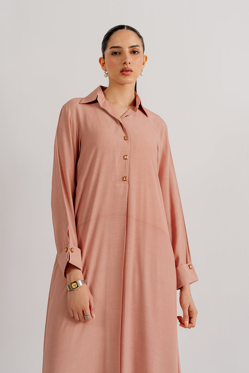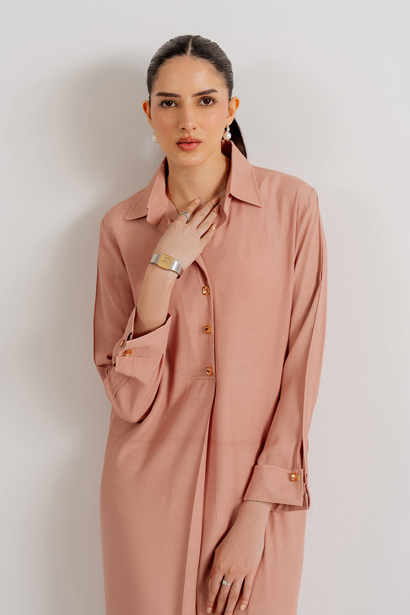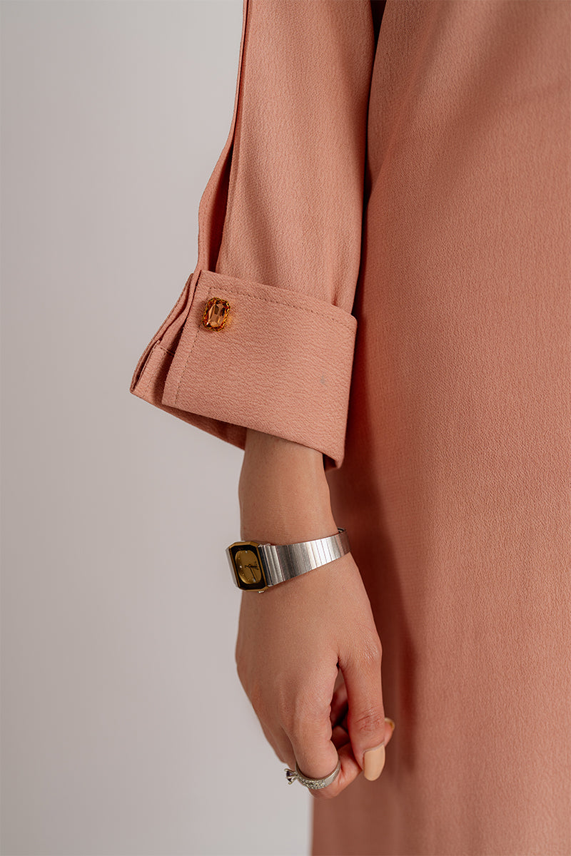 Soft yet striking, this peach crepe dress captures the essence of enduring elegance.