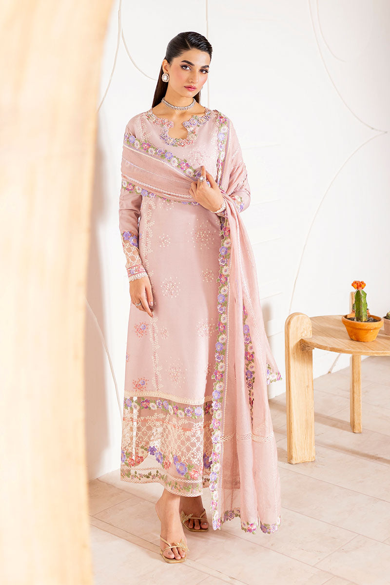 The ensemble is elevated by a flowing rocket net dupatta, finished with a fully embroidered border and subtle sequin detailing for just the right touch of shimmer. Paired with straight-cut raw silk trousers, Reyna exudes polished grace from every angle. Perfect for intimate celebrations and timeless moments.
