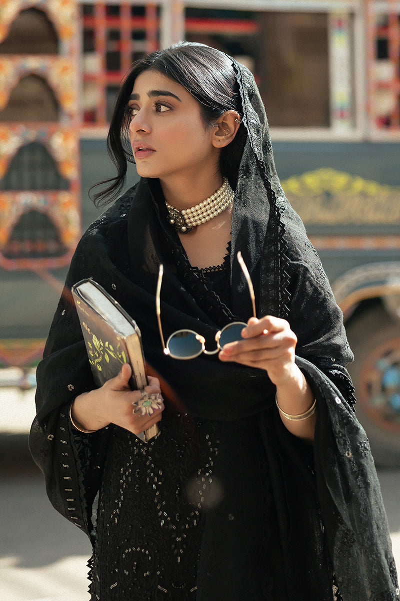 Rija, a striking all-black three-piece ensemble that exudes sophistication and grace. Crafted from premium cotton net, this outfit features intricate embroidery and delicate embellishments, creating a timelessly elegant aesthetic. The beautifully detailed shirt is complemented by a matching trouser, while the lightweight dupatta adds a touch of effortless refinement. A perfect blend of tradition and modern allure, Rija is designed to make a statement with understated charm.