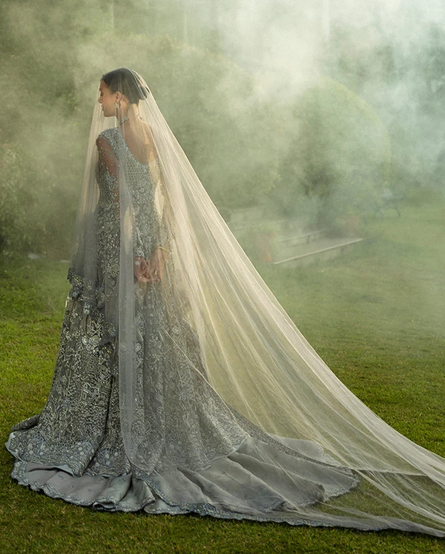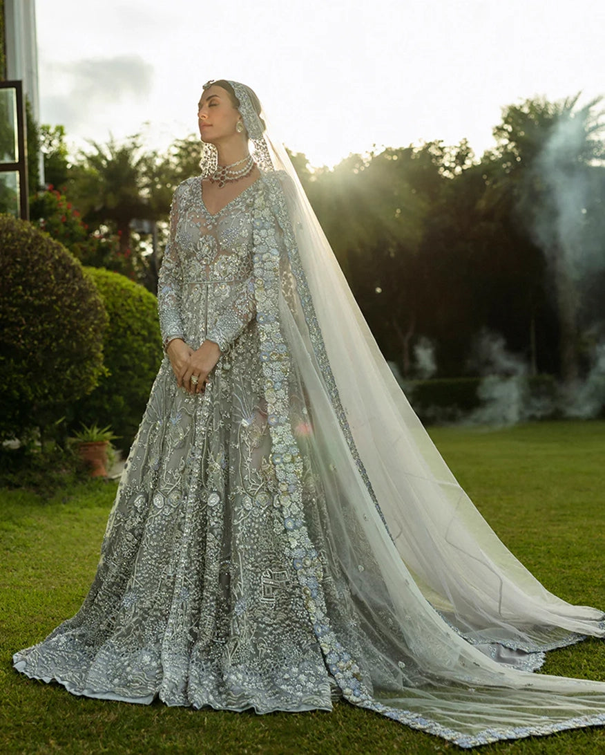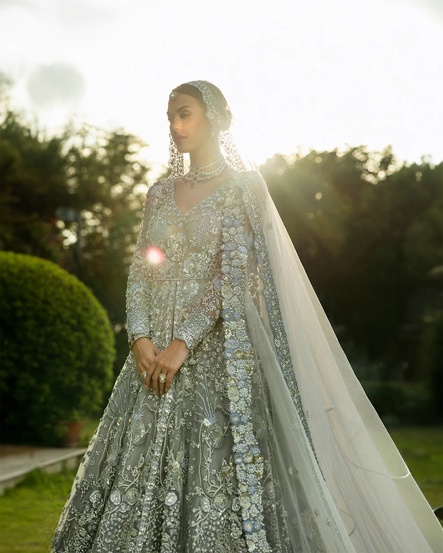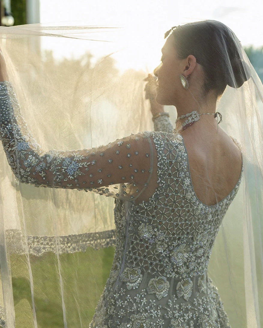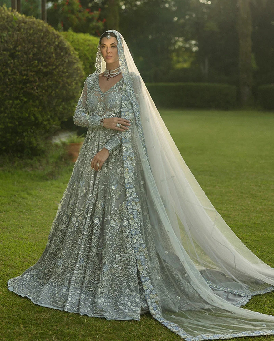 An ethereal ice-blue bridal masterpiece, exquisitely crafted on net and raw silk. The shirt glistens with intricate dabka, kora, pearls, Swarvoski crystals, and blue crystals, each detail thoughtfully placed to create a radiant glow. A dupatta with a delicate spray of pearls and sequins completes this timeless design, perfect for the bride seeking elegance in every thread.