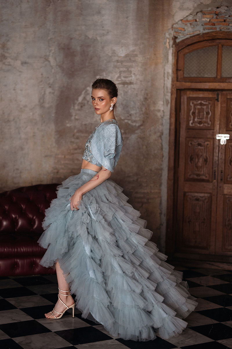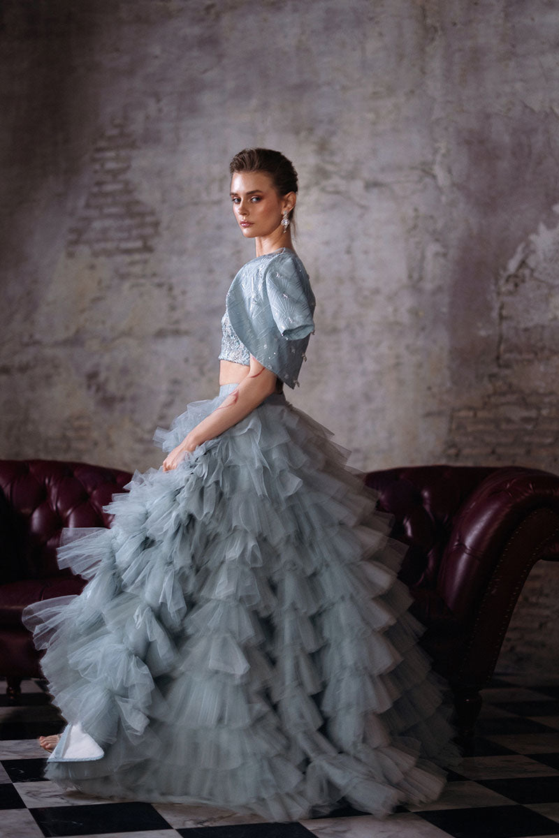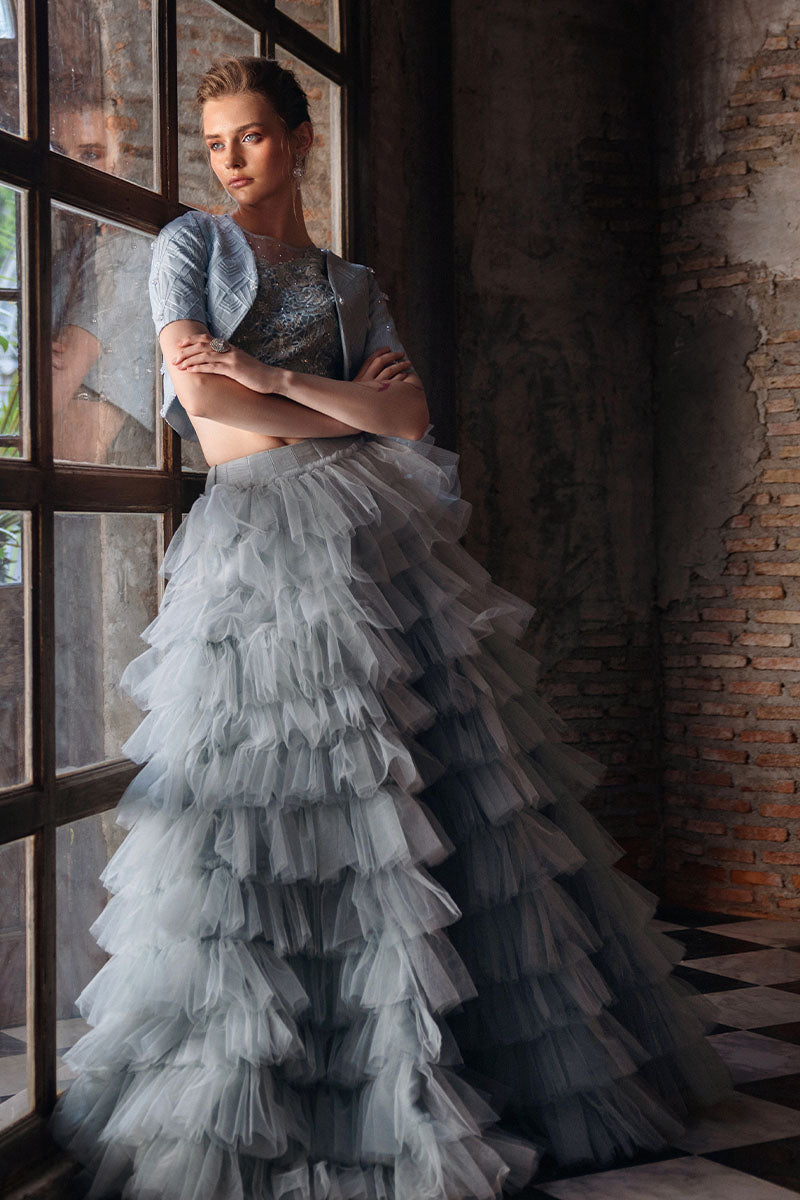 Satori is a blouse crafted from delicate organza, adorned with exquisite Resham embroideries that intricately weave a tale of timeless elegance. The blouse is further enhanced with delicate embellishments of sequins, adding a touch of shimmering allure to the ensemble. Accompanying the blouse is a half-sleeves jacket, elegantly embroidered with crystals hangings that sway with every movement, catching the light and creating a mesmerizing effect. Completing the ensemble is a skirt crafted from luxurious raw silk, featuring delicate net ruffles that add a hint of whimsical charm and movement.