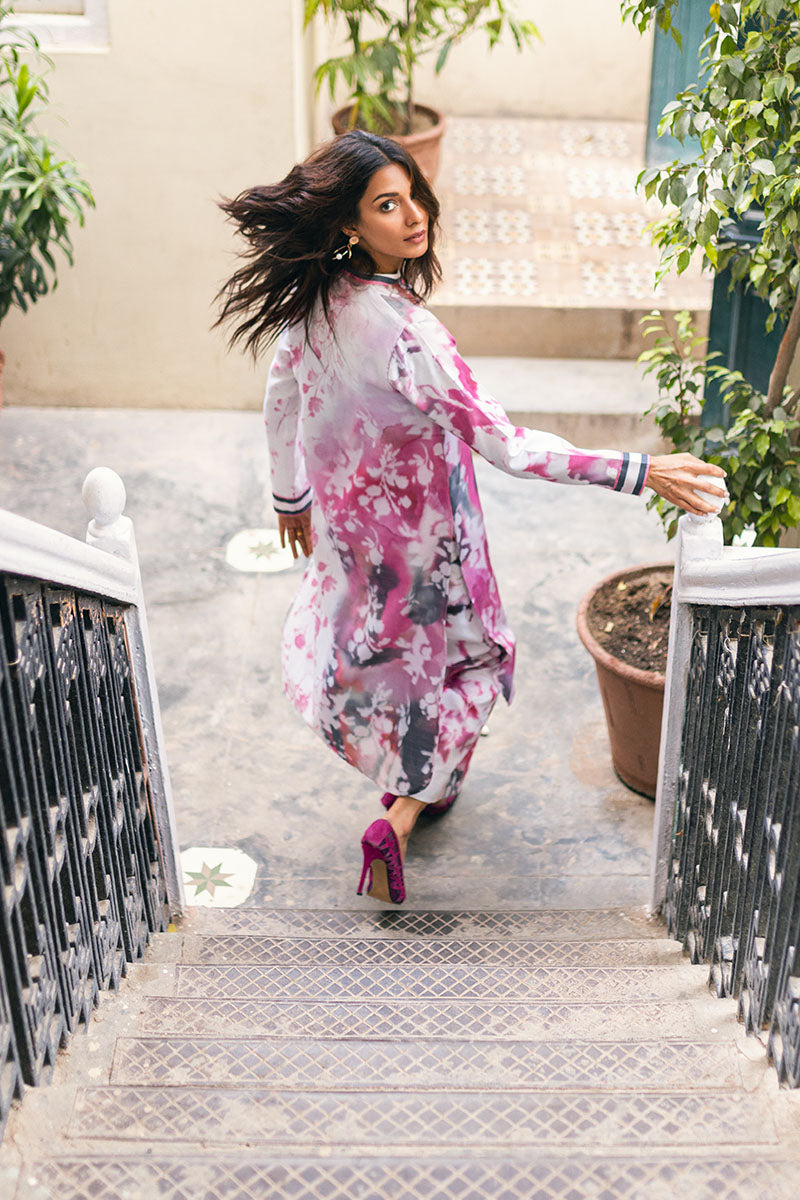 In the tapestry of fashion, the printed outfit is a masterpiece– a delightful outfit featuring a pink and white floral base, adorned with subtle accents of black. This enchanting ensemble is a poetic celebration of femininity, grace, and the timeless beauty of nature.