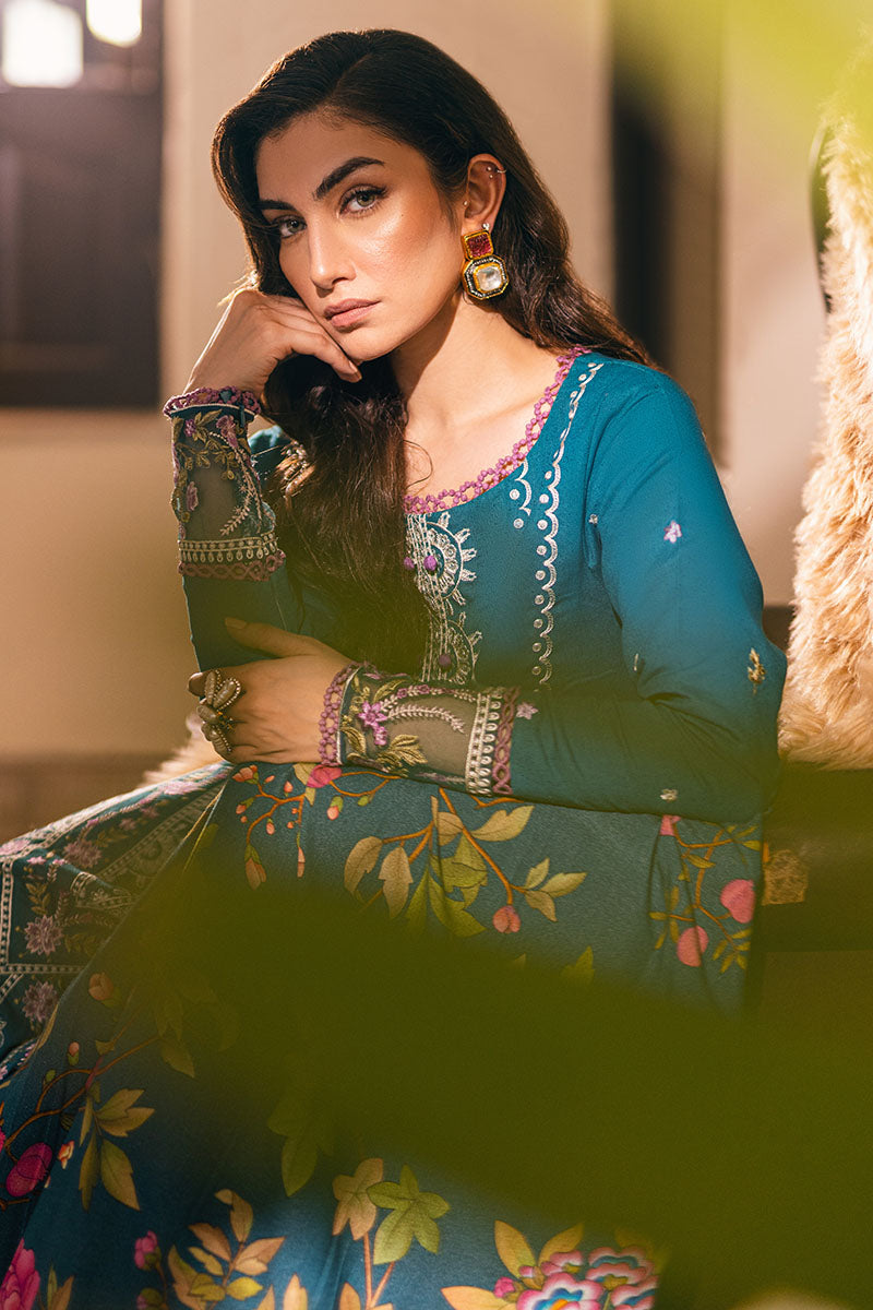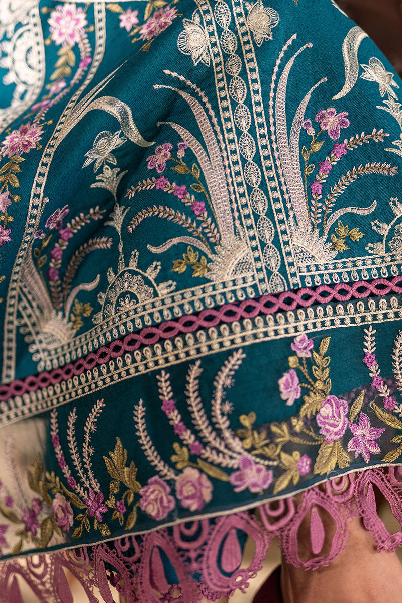Embrace the cozy charm of autumn with our Spiced Maple ensemble in rich teal. Featuring intricate embroidered karandi and a vibrant printed shawl, it’s the perfect blend of warmth and style for those crisp fall days.